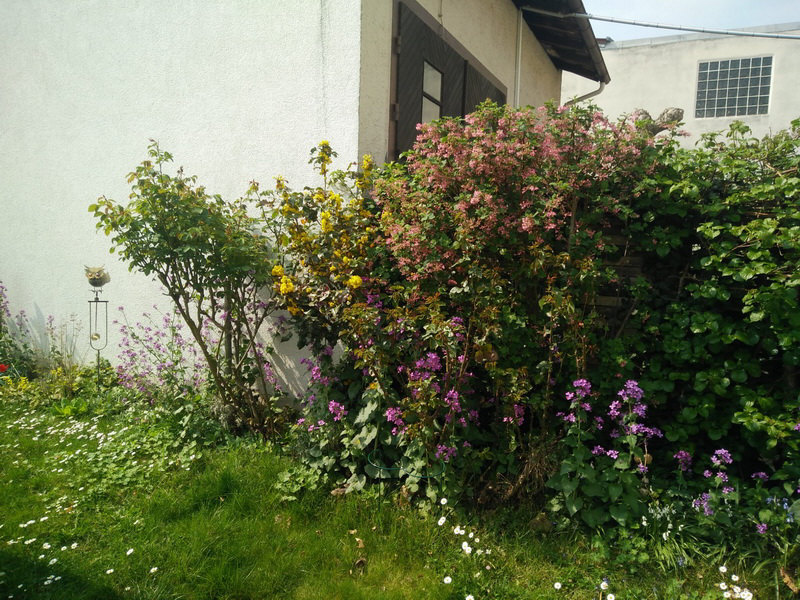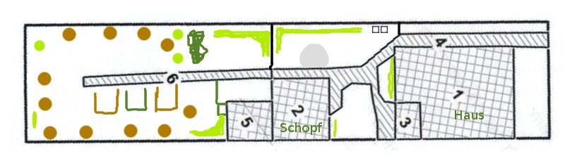 Heute sind wir mal woanders ... denn heute heißt es offene Gartenpforte ... zumindest virtuell ... denn wir sind genau hier: ![]() Das Ganze nennt sich "Lauras Garten" ... und Laura sagt folgendes dazu: 1 - Haus mit 3 Unterstand 2 - Schopf (Schuppen), dahinter 5 Hühnerstall Zwischen 5 und 6 ist eingezäunt, da spielte mein Sohn gerne 4 und 6 sind Wege. Die kleinen Vierecke unsere Mülltonnen Der graue Dreiviertelkreis ist der Sitzplatz Hellgrüne Linien sind Beete Hellgrüne Kreise Johannisbeersträucher Dunkelgrüne Linie ist die Brombeerhecke Die braunen Kreise sind Bäume (5 Apfel, 3 Birne, 1 Aprikose, 1 Zwetschge) Die offenen Vierecke sind unsere Beete, das linke war mal für Zucchini, die sind nun auf der anderen Seite, dafür dort alle möglichen Blumen (später blühend) das mittlere für Tomaten und das rechte für Gurken, Kohlrabi, Paprika, Lauch, etc.. Die Erdbeeren sind in dem kleinen Viereck neben dem Hühnerstall. Und nun gibts die Bilder zu den Erklärungen: ![]() ![]() ![]() ![]() ![]() ![]() ![]() ![]() ![]() ![]() ![]() ![]() Ich bringe mal ein paar Stühle ... denn wir bleiben ein paar Augenblicke an diesem schönen Fleck. |