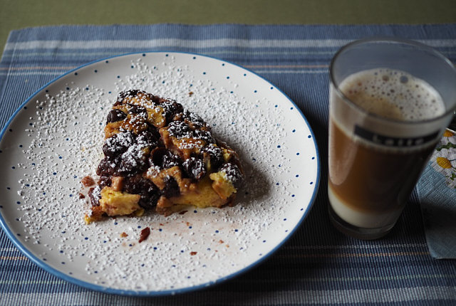 Darüber verteilt man gut abgetropfte Kompottkirschen und backt es bei