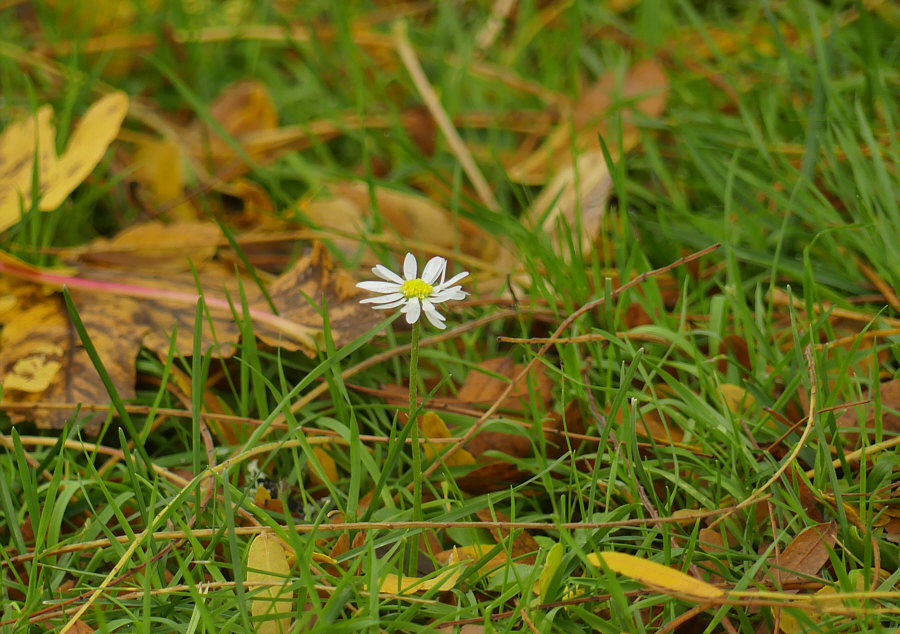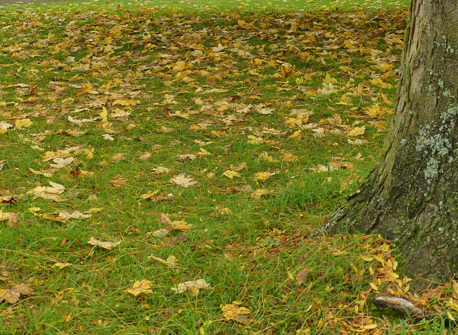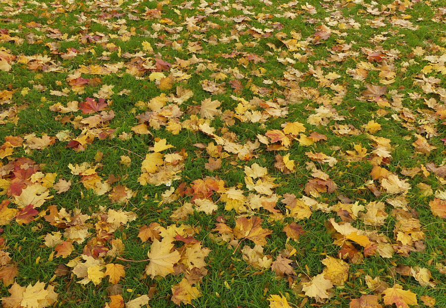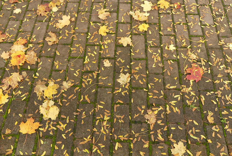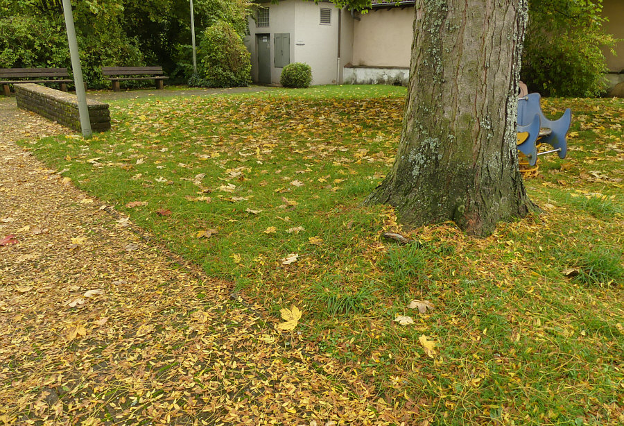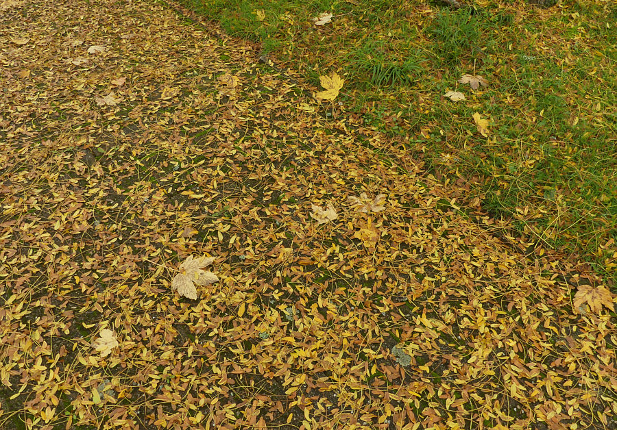 Die Haustüre öffnen. Die Treppe runter gehen. Ins Auto einsteigen. Losfahren. 3,6 km fahren. Langsam werden. Auto parken. Aussteigen. Zwei Meter laufen. Und schon die ersten Bilder machen. Genauso ist das vorgestern passiert. Direkt neben dem Parkplatz fand ich herbstliche Strukturen. ![]() Pflastersteine, grüne Fugen und darauf Blätter und die Flügel der Früchte der Ahorne, die da stehen. Ja doch, es heißt nicht Ahörner, sondern Ahorne, wie ich gerade gelesen habe. Mich hat fasziniert, dass man nicht nur Blätter sieht, sondern auch diese Flügel. Botanisch korrekt: "es werden Spaltfrüchte gebildet, die als zwei geflügelte Nussfrüchte (Samara) abfallen. Die Frucht führt durch ihre spezielle aerodynamische Form (Monopteros) beim Herunterfallen zu Autorotation, dieses bewirkt ein langsameres Absinken der Samen und eine großflächige Verteilung der Diasporen durch den Wind." Ja, auch ich beginne mit der Autorotation, wenn ich falle, aber ich werde nicht langsamer dabei ;)). Sorry ... ich wollte und sollte ja ernst bleiben. Es geht schließlich um die Bilder ... ![]() ... und um diese warmtönigen Strukturen. Mal mit mehr Blättern ... mal mit weniger ... ![]() ... und mal sind fast nur Flügel auf dem Bild zu sehen. Während auf dem Rasen ... ![]() ... fast nur Blätter liegen bzw. die Flügel nicht so auffallen, weil sie nicht oben drauf liegen, sondern zwischen die Halme sinken. Man stelle sich vor ... beim Fotografieren des obigen Bildes hätte die Sonne geschienen. Das wäre ein Leuchten gewesen ! Oder bei diesem: ![]() Wir schauen die ganze Zeit auf den Boden ... ![]() ... was ja im Sinne der Trittsicherheit gut ist ... aber die Vielfalt der Umgebung bleibt da außen vor. Denn es gäbe ... ![]() ... eine Mauer, Bänke, ein Gebäude, einen Baum (vermutlich Ahorn ;)) ) und ein Hoppelgerät zu sehen. Und noch was, was auf dem großen Bild zwar vorhanden ist, man aber nicht sieht. Nicht, wenn man nicht weiß, dass es da ist. Das ist halt der Vorteil des "Persönlichanwesendseins" ... man sieht mehr. Das man ja dann aber fotografieren kann ... und zwar so ... ![]() ... dass es andere auch sehen. Nicht ? Doch ! Nicht ? Nicht doch ... ... okay, ich gehe noch etwas näher ran: ![]() Wie sehr doch so ein Rahmen bei der Suche hilft ... ![]() ... nach dem, was da inmitten all der herbstlichen Strukturen zu finden ist. ![]() Und dieses kleine Wunder ist nun etwas, das wirklich jeder sehen kann. Auch der mit Stock, Gehwägelchen oder Rollstuhl, denn wir sind ja nur zum Auto und dann wenige Schritte gegangen. Okay, für das nächste Foto muss man sich bücken können ... ![]() ... es sei denn, man sitzt an Laptop, PC oder Handy :). |