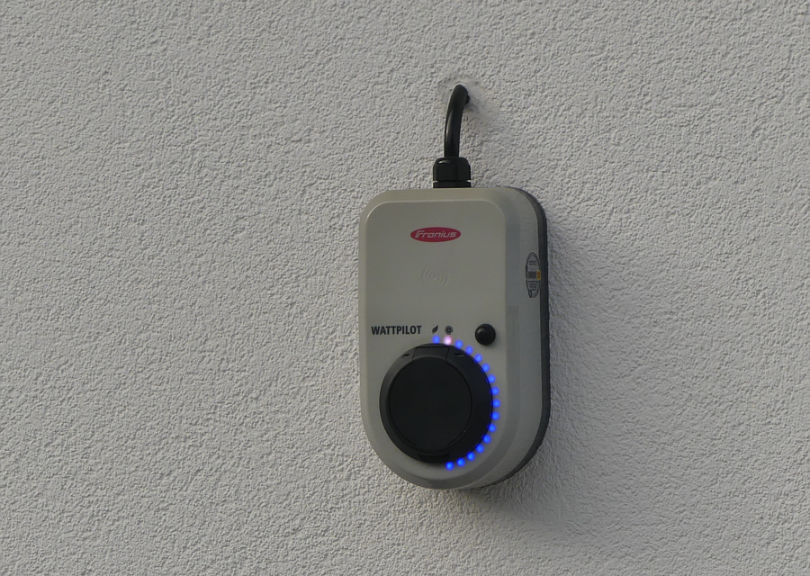 ... eine Elektroauto-Ladesteckdose an der Hauswand aus.