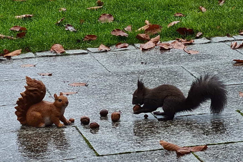 Und dann geschah das: ![]() Christine schreibt dazu: "Ja wir füttern Eichhörnchen. Auch mal da an der Terasse, weil wir da vom Esstisch aus hinsehen. "Haben aber auch ein Eichhörnchen-Futterhaus. In unserem Garten leben einige Eichhörnchen. Eigentlich sind alle dunkelbraun und wir nennen sie 'Jacob'. Als ich neulich in einem Gartencenter war, sah ich ein rotbraunes Eichhörnchen aus Kunstharz oder Plastik. Hab es auf die Terrasse gestellt und einige Hasel- und Walnüsse dazu. Es dauerte nicht lange, dann kam Jacob vorbei, schnupperte rum schnappte sich Nüsse und sprang davon. Er kam aber immer wieder... Die 2 verstehen sich recht gut, kein Wunder, denn die Nüsse bleiben ja alle für Jacob!" |