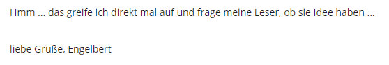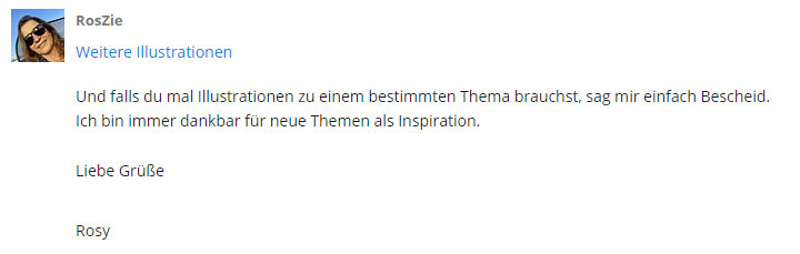 Ihr erinnert Euch sicher an den 6. Januar, als hier viele Grafiken der Heiligen Drei Könige zu sehen waren: ![]() Grafiken, von Rosy alias RosZie gestaltet. Ich hatte auch Kontakt mit Rosy ... und ihr gesagt, dass ich gerne und jederzeit wieder was von ihr zeigen will. Worauf sie mir antwortete: ![]() Worauf ich ihr folgendes schrieb: ![]() Und heute ist dieser Tag, an dem ich frage. Welchen Themen fallen Euch denn ein, zu denen man ganz unterschiedliche Grafiken machen könnte. Macht Vorschläge ... alles ist möglich ... danke :)). |