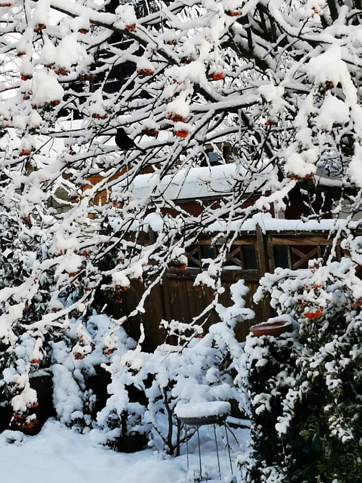 Ilse hat eine Eberesche mit roten Beeren und Amsel fotografiert: