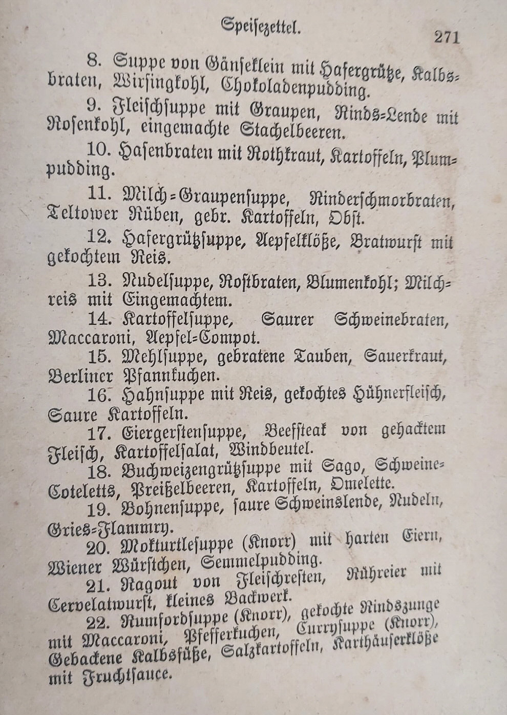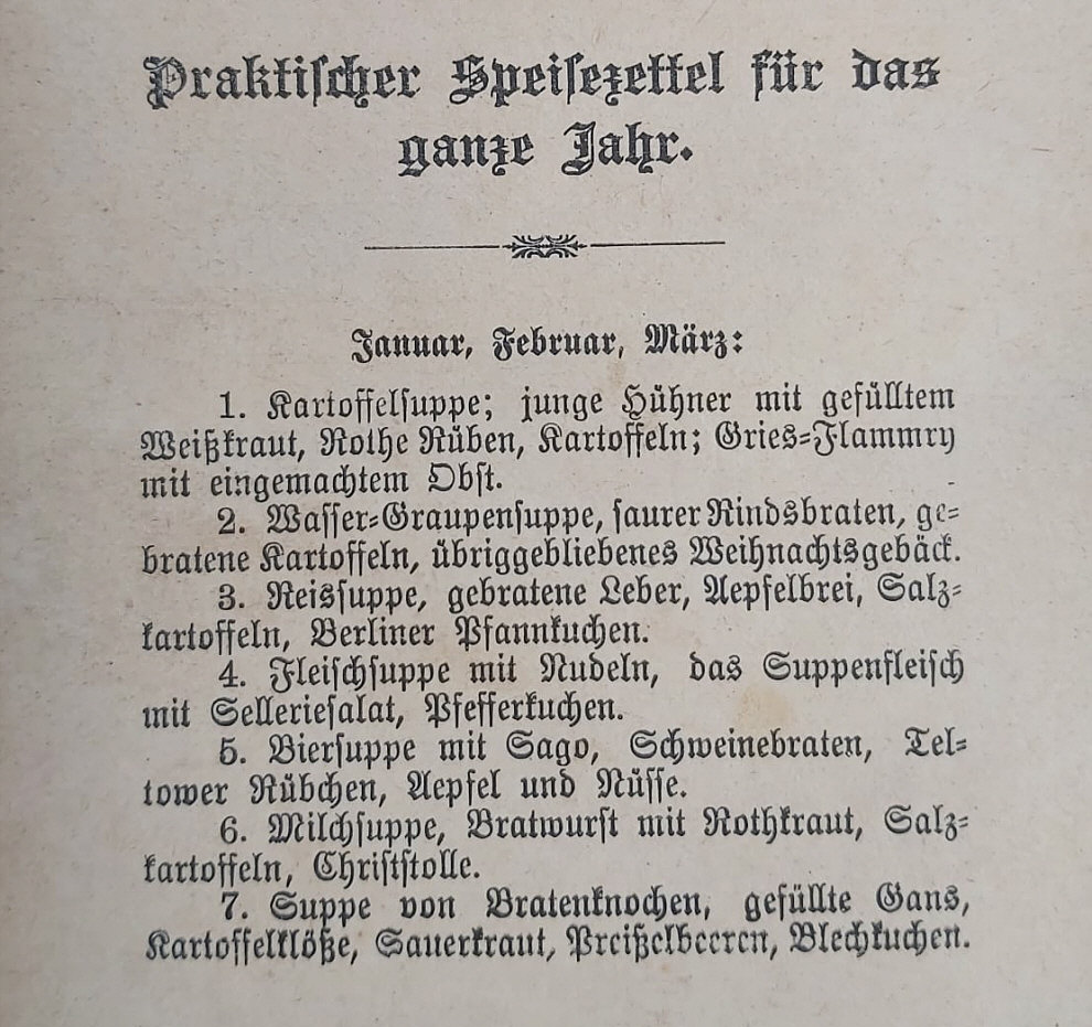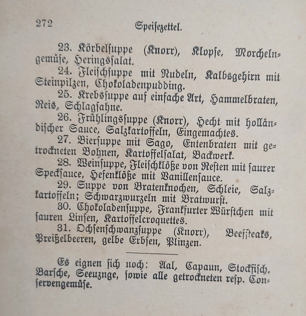 Das ... ![]() ... ist ein Schätzchen. Ein Kochbuch aus dem Jahr 1890. Dort ist auch ein ... ![]() ... drin. Das Schätzchen gehört Janna und sie hat uns mal diesen Speisezettel fotografiert. Ich muss aber vorher sagen, dass sich das Buch ganz bestimmt nicht an ganz normale Arbeiterfamilien richtet ... wo es nur einmal in der Woche Fleisch gab. Ich denke, die hatten solche Kochbücher nicht, sondern kochten so, wie es der Garten, der Vorratsschrank oder der Keller hergab. Solche Kochbücher dürften bei Menschen mit viel mehr Geld gelegen haben. Vielleicht gab es dort sogar einen dienstbaren Geist in der Küche. Hier ist der Speiseplan: ![]() ![]() ![]() Ganz egal, ob man das heute noch so kochen mag oder nicht oder ob das damals wirklich so gekocht wurde ... ... das Buch ist ein sehr interessantes Zeitzeugnis. Und im Speiseplan ist vielleicht sogar die eine oder andere Anregung oder Erinnerung enthalten. |