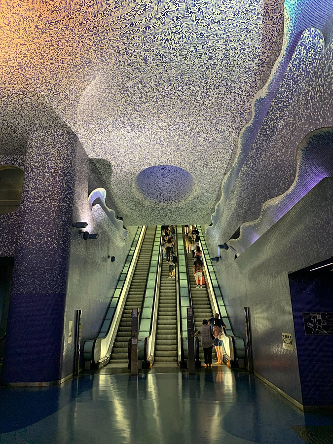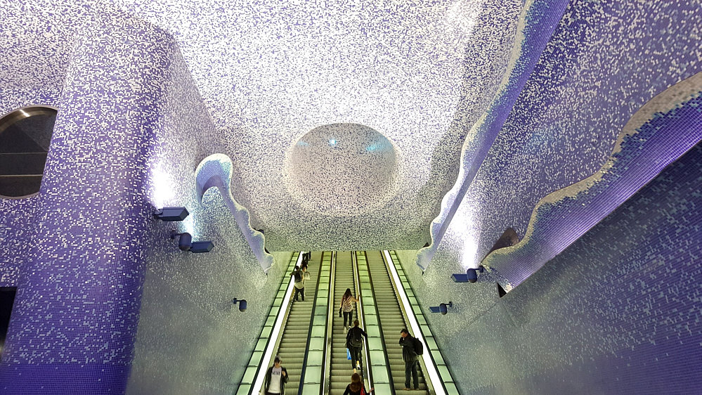 ![]() ![]() Wir sind heute im "U-Bahnhof Toledo" ... er soll einer der schönsten Bahnhöfe Europas sein. Das Thema, das der Architekt gewählt hat, ist "Wasser und Licht". Das Element Wasser ist das silberne Mosaik, das Herzstück des Projektes ist das Licht, bzw. die Verbindung von natürlichen und künstlichem Licht. Wenn wir uns umdrehen, können wir U-Bahn fahren ... wenn wir der Rolltreppe hinauf folgen, dann können wir die Stadt Neapel erkunden. Ganz in der Nähe des Bahnhofs befindet sich das Quartieri Spagnoli, das Spanische Viertel der Stadt. (doch lieber in die Kirche ... klicke hier) |