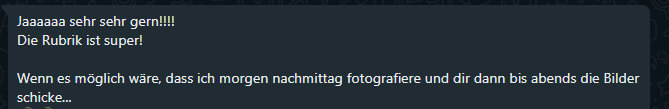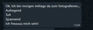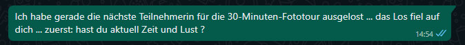 ![]() Die Aufgabe ist: (Du sagst mir, wo ungefähr du wohnst und ich suche dir eine Straße aus, die ich nicht kenne und du vielleicht auch nicht. Du fährst dorthin, steigst aus dem Auto aus oder vom Fahrrad, stellst den Timer auf dem Handy und dann hast du 30 Minuten Zeit, zu fotografieren. Von all den Bildern suchst du dann 10 aus, die ich zeigen werde.) Folge Nummer 3: Christine L. Am 7. Februar hatte ich Christine L. folgendes über Whatsapp geschrieben: ![]() Ihre Antwort: ![]() Christine wohnt nordwestlich von Augsburg. Ich hab dann geschaut, in welcher Straße sie fotografieren könnte und einen Ort ausgesucht, den Christine nur vom Durchfahren kennt. Die Straße selbst hat sie gar nicht gekannt. Und so sind wir heute ... ![]() ... in der Straße "am Geiselbach" in ... ![]() ... Zusamaltheim. Nachdem ich Christine die Straße gesagt habe ... ![]() ... war sie schon fast unterwegs ;)). Und als die halbe Stunde vorbei war, hat sie mir noch vor dem Einsteigen ins Auto eine direkt euphorische Sprachbotschaft per Whatsapp geschickt: Ich hab gerade meine 30 Minuten-Foto-Tour beendet und ich bin total happy was ich alles entdeckt habe. Ich hätt grad noch eine Stunde gehen können. So eine tolle Inspiration die die Birgit gehabt hat und du machst es möglich, dass sich soviel daran beteiligen können. Ich finde es so toll, wie viele sich beteiligt oder sich angemeldet haben und ich bin total erfreut, happy und weiß nicht was ich sagen soll. Ich hab heut natürlich einen gigantischen Tag erwischt. Hat zwar glaub ich minus 2 Grad, etwas Schnee liegt, aber Sonne, Sonne, Sonne. Ja jetzt fahre ich nach Hause und schau mal, welche Bilder ich dir schicke. Und hier sind die Bilder: ![]() Mich begrüßte ein süßer grüner Frosch auf der blauen Kugel. Er schaute mich zwar nicht an, trotzdem erfreute ich mich an ihm. ![]() Hier stand ich nun am Geiselbach und schau auf das sanft fließende Wasser, er kommt mir eiskalt vor bei diesen Temperaturen. Aber im Sommer stelle ich mir darin zu kneippen herrlich vor! ![]() Ich laufe weiter und sehe pickende Hühner (schwäbisch: Henna) in der Sonne, diese schöne weiße possierte sich richtig für mich und Euch! ![]() Schaut mal, was für ein herrliches sonniges Winterwetter heute ist, ich bin total begeistert und freu mich sehr für Seelenfarben unterwegs zu sein :-). ![]() Da entdecke ich an einem Holzstadel dieses tolle Kaffeekannen-Vogel-Haus. Leider ist es noch nicht bezogen, soviel ich sehen kann. ![]() Nochmal schaue ich auf den schmalen 'Geiselbach' zurück, der die ganze Zeit neben der Strasse daher fließt. ![]() Genießt einfach den Weitblick in die schöne winterliche schwäbische Landschaft - so habs ich auch gemacht! ![]() Das kleine Blumenelfenkind hält geduldig Schnee in den Händen und wartet auf den Frühling. ![]() Einfach nur: TRAUMWETTER ! ![]() Zum Abschluß lächelte mich dieser lustige Glaskopf an und verabschiedete mich aus der Straße "am Geiselbach". ![]() Bonusbild: ich wink Euch allen mal ganz herzlich zu :-). |