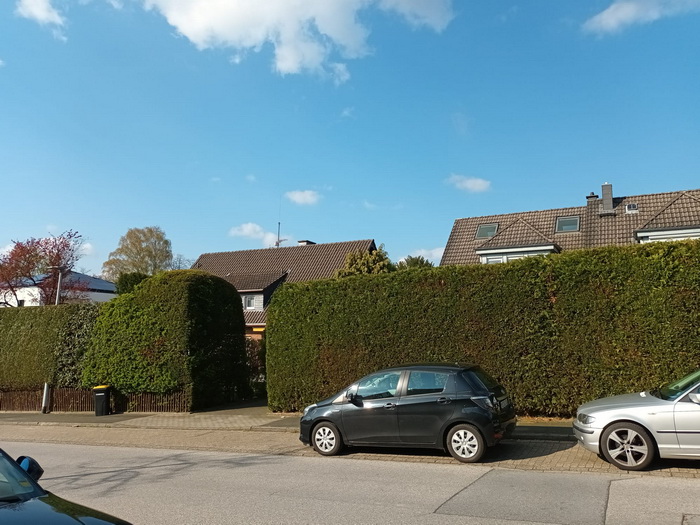 10Es war ein schöner Spaziergang an einem sonnigen Nachmittag gegen halb fünf. Einerseits war ich froh, dass um diese Zeit kaum jemand unterwegs war, ca. 4-5 Fußgänger, 2 Hunde und 3 Autos, die mir entgegen kamen. So fragte niemand, was ich da mache. Andererseits hat es mich schon gewundert, dass alles so ausgestorben war. Kein Kind auf der Straße, auch nichts aus den Gärten zu hören. Das wäre "zu meiner Zeit" sicher anders gewesen. |