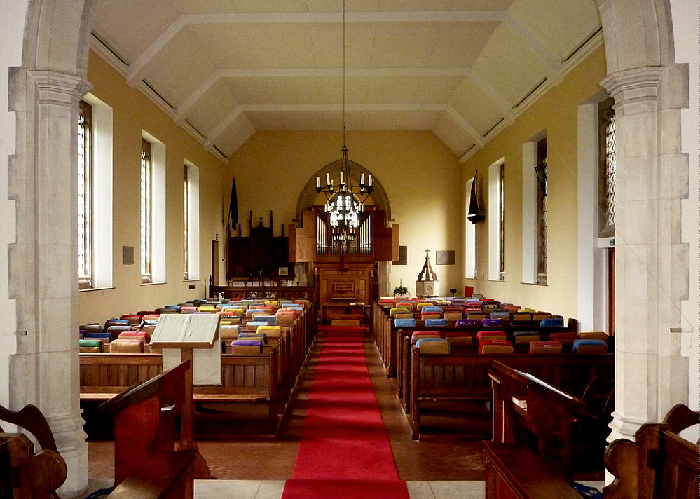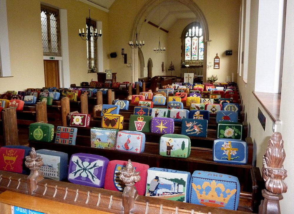 Wir sind heute in einem kleinen Dorf ... ![]() ... im Osten von England ... in Chelmondiston mit ca. 1000 Einwohnern. Dort gibt es diese Kirche. ![]() Und da gehen wir jetzt rein: ![]() Die kleinen bunten Dinger, die wir sehen ... ![]() ... sind Kniekissen, damit man beim Beten auf den harten Kirchenbänken die Knie schont. Diese Kissen werden von den Pfarreifrauen liebevoll und individuell bestickt. Willkommen in der Sonntagskirche von Seelenfarben :)). Deine Gedanken zur Kirche und zum Kircheninnenraum ? (woanders hin ... klicke hier) |