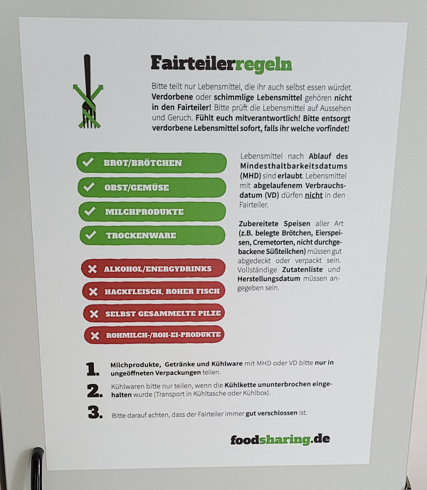 Für manche ist das nix. Für alle ordentlichen, die nur das kaufen, was sie auch verbrauchen. Oder die immer schön darauf achten, dass nichts abläuft oder zu viel ist. Aber für die, die schon mal was zuviel kaufen, die "ach ist auch noch da" sagen oder sich einfach dieser Sache verschrieben haben, ist das schon was. Es geht um Foodsharing Food heißt "Essen" und sharing heißt "teilen". Essen teilen ... oder verteilen. Das was man zuviel hat, der Allgemeinheit zur Verfügung stellen. Zitat: "Unter dem Begriff Foodsharing ist eine soziale Bewegung entstanden, die sich der Verteilung von überschüssigen Lebensmitteln widmet". Leider ist die Bewegung noch nicht überall angekommen, es gibt große Lücken auf der Landkarte, wo nichts verteilt wird. Aber dort, wo es angenommen wird, ist das eine Bereicherung. Deutschland, Österreich und auch die Schweiz machen mit. Es gibt Regale oder Kühlschränke, an denen man Lebensmittel kostenfrei abholen oder vorbeibringen kann. Auf der Seite Foodsharing kann man sehen, ob es da was in der Nähe gibt. Ganz neu gibt es 10 Kilometer von uns entfernt einen solchen Kühlschrank. Und da gehn wir jetzt mal hin ... er steht in ... ![]() ... der Kreissparkasse in Homburg. ![]() Da hinten in der Ecke. ![]() Lesen wir doch erstmal, was rein darf und was nicht: ![]() ![]() Und nun öffnen wir mal den Kühlschrank: ![]() Oben leer ... ![]() ... und unten auch. Und der andere Schrank ? ![]() Da liegen zwei einzelne Brote drin. Ich hab dann eine Familienpackung Zwieback dazu gelegt. Sehr lobenswert (und sicher auch notwendig) ist, dass da immer jemand nach dem Rechten schaut: ![]() ![]() Deine Gedanken zum Foodsharing ? |