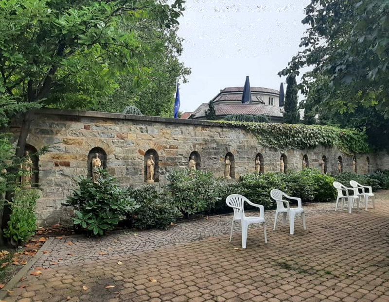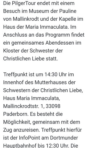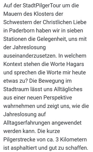 Frauke nimmt uns heute mit. Wir gehen mit ihr mit auf StadtPilgerTour zur Jahreslosung in Paderborn. Frauke zeigt und schreibt: ![]() ![]() ![]() ![]() ![]() Ein wunderschöner weitläufiger Garten ... ![]() ... mit Sitzgelegenheiten und Kunst. ![]() ![]() ![]() Eine über 100 Jahre alte Lindenallee: ![]() Auf dem Friedhof, vor der Kapelle, beeindruckende alte Bäume: ![]() Wir haben viel erfahren über Pauline von Mallinckrodt, 1849 gründete sie das Kloster in der Bussdorfkirche. ![]() ![]() Es ging entlang an beeindruckenden Mauern ... ![]() ... in Richtung Stadt ... und plötzlich standen wir in diesem Kreuzgang: ![]() Unfassbar, wie alt das Gemäuer ist. ![]() Weitere Informationen über Hagar, ägyptische Sklavin 520 v. Chr.. ![]() ![]() ![]() Im Zentrum von Paderborn weitere beeindruckende Bäume: ![]() Blick auf die Pader: ![]() Blick zum Dom: ![]() ![]() Im Innenhof das bekannte Hasenfenster: ![]() ![]() Wieder ein beeindruckender Kreuzgang: ![]() Die frisch renovierte Krypta: ![]() ![]() Der Dom: ![]() Blick zurück auf die beeindruckenden Bauten: ![]() ![]() Eine besondere Persönlichkeit: ![]() Im Kloster gibt es auch ein kleines Museum: ![]() Paulines Wohnraum: ![]() ![]() ![]() Zum Abschluss in die Kapelle: ![]() Heute mal ein Sonntagsspaziergang ... mit Frauke auf StadtPilgerTour zur Jahreslosung in Paderborn. |