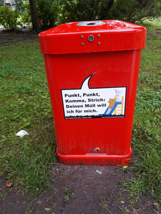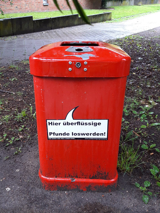 Mal was anderes im Kalenderblatt ... wie wäre es mit Mülleimer als Überschrift ? Grell und rot ... aber mit tollen Sprüchen. Angelika V. war doch in Neuallermöhe unterwegs für die Fotoaktion. Sie hat nicht nur diese Fotos mitgebracht, sondern auch Mülleimer. Angelika sagt: "Diese roten Mülleimer findet man überall in Hamburg. Aber ich habe sie noch nie in einer solchen Dichte gesehen wie in Neuallermöhe. Vielleicht sind sie für dich interessant für ein Kalenderblatt, vielleicht sind sie ja auch nur blöd." Blöd ? Ganz im Gegenteil ... die sind genial ! Wunderbare Wortfindungen zu einem Thema. Selbstverständlich ist das was für ein Kalenderblatt :)). ![]() ![]() ![]() ![]() ![]() ![]() ![]() ![]() ![]() ![]() ![]() ![]() ![]() ![]() |