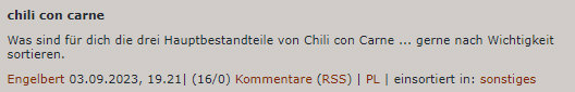 Drama in mindestens drei Akten. Der Name: Bohnen würden sich lohnen. Untertitel Kann man Bohnen klonen ? Prolog 1 Und es stand die Frage im Raum: Gehören denn überhaupt Bohnen in ein Chili con Carne ? Eigentlich ... nein ... die Grundzutaten sind nur Chili, diese scharfen Schoten und Carne, was ja Fleisch bedeutet ... im Original-Texas-Chili (von dort kommt es ja her) sind keine Bohnen drin ... aber in vielen anderen Varianten gibt es welche. Weil mich dieses bohnenlose überrascht hat, hatte ich im Tagebuch gefragt: ![]() Das Ergebnis: alle, aber wirklich alle, haben Bohnen als Zutat genannt. Also sei es so. Bohnen tun sich lohnen im Chili con Carne. Prolog 2 Es war im Jahr 2019 ... ... als die Welt noch eine andere war. Nur eines war ziemlich gleich ... diese Dose hier: ![]() La Finesse ... die Feinheit ... eine Delikatesse. Steht zumindest drauf. Gibts bei Aldi. Merkt Euch mal das Design. Was ist drin ? Sorry ... was "war" drin ? ![]() Auch mal merken ... 27 % Bohnen. 1. Akt Beate greift spontan zu im Aldi. ![]() Vier Jahre später ist aus La Finesse die Speisezeit geworden. Genau gleiches Bild ... nur andere Name. Aha ... "speisen" bedeutet: in gepflegtem, gehobenen Rahmen eine Mahlzeit mit edlen, guten Speisen zu sich nehmen. Klingt ja nicht so schlecht ... aber. 2. Akt Beate steht in der Küche ... der Inhalt der Dose in einem Topf. Beate ruft mich übers Haustelefon an: "Du, Engelbert, da sind ja so gut wie keine Bohnen drin". Sagts, öffnet eine kleine Dose Bohnen zusätzlich und schüttet diese rein. 3. Akt Ich schaue mir das mal genauer an ... und nachdem ich die Tatsachen gesehen hatte, fange ich an zu recherchieren ... hier noch mal die Erinnerung an früher, anno 2019: ![]() Und jetzt ... tata ... gibts gleich die Realität von heute ... ... ganz dramatische Hintergrundmusik ... und Tusch: ![]() Liebling, ich habe die Bohnen geschrumpft. Und das bei gleichem Design ... bei gleicher Abbildung auf der Dose. Zu einem deutlich höheren Preis. Und die Zutatenliste ist gewachsen. Vorhang zu. Vorhang geht wieder auf ... es verbeugen sich: Aldi, Finesse, Speisezeit, Beate und einzelne Bohnen. Nicht in kühnsten Träumen würde ein solches Drehbuch entstehen, doch die Realität macht solche Dramen ohne Probleme möglich. |