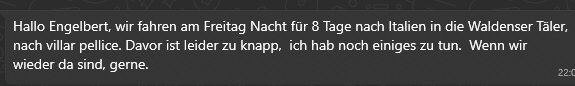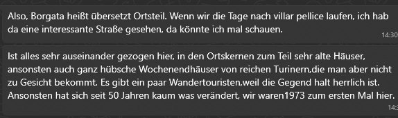 ![]() Spezial-Ausgabe In dieser Folge: Elli K. Spezial, weil ... siehe diese Kommunikation per Whatsapp, grün hinterlegt bin ich, grau hinterlegt die Elli K.: ![]() ![]() ![]() ![]() ![]() ![]() ![]() ![]() Und weil das keine ganz normale Straße ist, darf Elli K. zu einem späteren Zeitpunkt nochmal eine Straße in ihrer Heimat fotografieren und heute gibts die Spezial-Ausgabe aus dem Italien-Urlaub. Elli K. zeigt und schreibt: ![]() Mein Straßenbericht kommt aus dem Norden Italiens. Engelbert fragte mich, ob ich aus dem Urlaub vielleicht eine Straße fotografieren möchte und suchte mir eine Straße in der Nähe aus. Nun ist das hier so, dass die Dörfchen meist nur an der Durchgangsstrasse entlang sind, die Häuser dahinter sind kreuz und quer mit kleinen Zugangsgässchen gebaut. Wir laufen einfach mal los, von unserer Unterkunft bis ins nächste kleine Dörfchen. ![]() Vorbei an herrlichen Wiesen geht die Straße durch kleine Häuser-Ansammlungen, Borgata irgendwas genannt, laufen wir ungefähr 40 Minuten bis nach Villar pellice. ![]() Hier in Borgata buffa. ![]() Der Dorfbrunnen. ![]() Es sind etwa 10 Wohnhäuser. ![]() Dazwischen immer wieder Bauernhöfe mit ein paar Kühen oder Ziegen und sehr großen Misthaufen. ![]() Wir überqueren den Pellice auf einer Brücke, da sind immer kleine Ausbuchtungen, denn wenn ein Auto oder ein Traktor kommt, müssen die Fußgänger ausweichen. Es passt immer nur ein Kinderwagen und 4 Personen rein ... ![]() Die Straße ist eng, sie ist zum Teil ein Rundweg des Schneckenpfades, der von Menschen mit Rollstuhl benutzt werden kann. Die Schnecke ist hier hoch angesehen, war sie doch früher eine gute Abwechslung für die arme Bevölkerung. ![]() Der kleine Anstieg zum eigentlichen Dorf geht nochmal steil bergan, es gibt überall riesige Holunderbüsche. ![]() Das Dorf hat mit seinen "Borgatas und Riversos", das sind Ortsteile, ca 1000 Einwohner, eine Pizzeria, ein Café, Bäcker, Metzger und 2 Alimentaris, also Tante Emma Läden. Wir freuen uns jetzt auf einen Cappuccino und die Kinder auf ein Eis. ![]() Zurück geht es dann an der Pellice entlang. Der große Bestand an Tamariskenbäumen ist wunderschön und es zwitschern hier bis zu 70 Vogelarten. ![]() Ich hoffe, es hat euch gefallen auf der kleinen Wanderung von Il Castagneto nach Villar Pellice, einem kleinen Paradies in den Waldenser Tälern in der Piemont, 60 km von Turin entfernt. |
