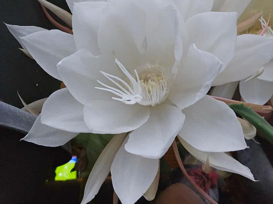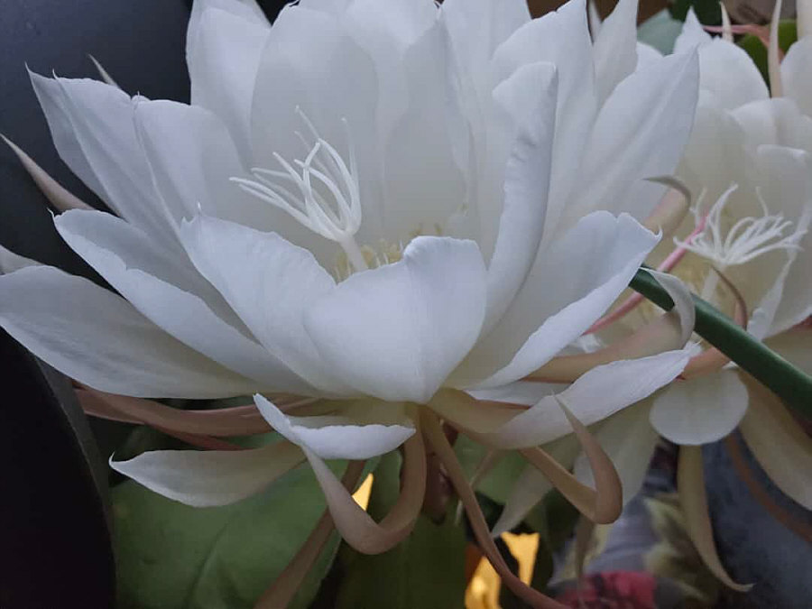 ![]() ... und da hängen da drei Blüten. Wenns Tag ist, hängen die immer ... entweder sind es noch Knospen, oder sie sind schon verblüht ... denn diese Blüten gehen in der Nacht auf und sie blühen auch nur diese eine Nacht lang. Zu solchen Blumen sagt man "Königin der Nacht". Diese Bezeichnung steht für zahlreiche großblütige, nachts blühende Kakteenarten, unter anderem: Selenicereus, Epiphyllum, Peniocereus, Hylocereus und Echinopsis. In Juttinchens Fall dürfte das eine Epiphyllum sein.