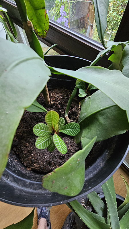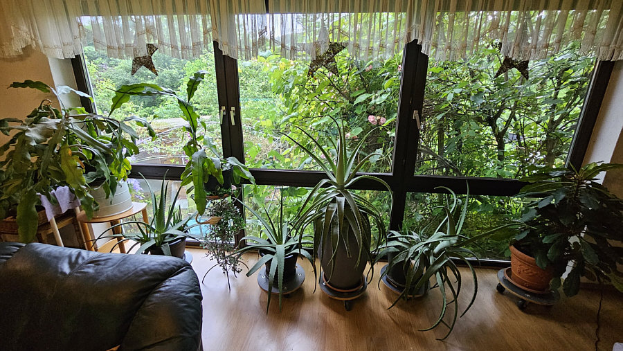 ![]() ... das ist eine "Spuckpalme" ... sie heißt so, weil sie ihre Samen meterweit spuckt. Und so geht im entfernt stehenden Topf der Königin eine neue Spuckpalme auf. Das ist das ganze Blumenfenster: ![]() Ganz links ein Ableger der Königin mit der 1. Blüte. Daneben eine ausgewachsene Königin, an der die gezeigten Blüten waren. Daneben eine Aloe Vera. Dann noch ein Königin-Ableger, dann folgen noch 3 Aloe und die ausgewachsene Spuckpalme. Drei weitere Spuckpalmen sind im Haus verteilt. |