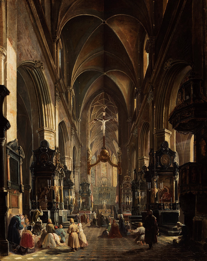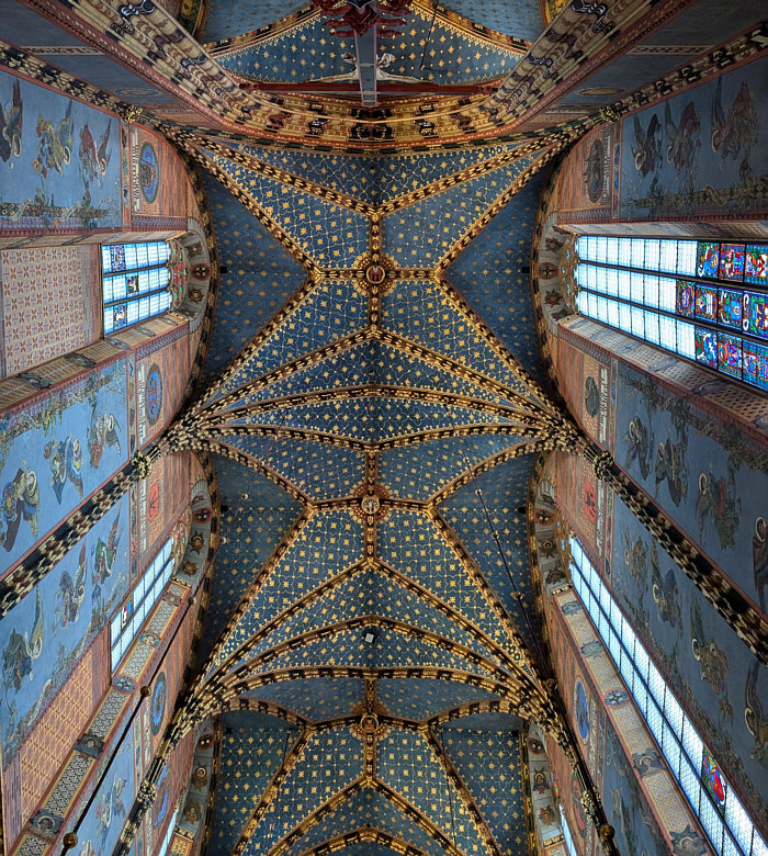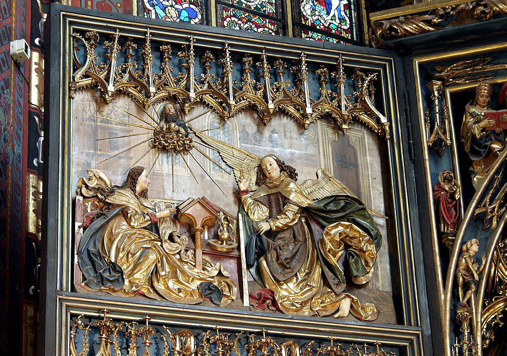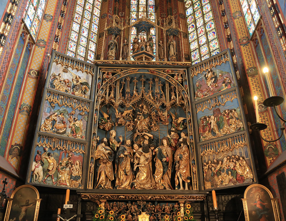 Nehme ich eine fröhliche, bunte Sonntagskirche, weil Fasching ist und weil unser aller Herzen oft schwer sind und ein bisschen Heiterkeit freundlich begrüßen würden ? Nehme ich eine einfache Sonntagskirche, aus Ausgleich zur Närrischkeit oder weil zur aktuellen Lage keine andere Kirche passt ? Ich entscheide mich für eine Kirche, die ich vor zwei Wochen gesehen und die mich sehr beeindruckt hatte. Ich hatte sie bei einer Seelenfärblerin im Status gesehen und mich auf die Suche nach Infos und Bildern zur Kirche gemacht. Es war mir eine große Freude, diese schöne Kirche im Status zu entdecken und habe dann nachgeschaut ... bereits vor über 10 Jahren hatte ich einen Sonntagskirchenordner angelegt, wo auch diese Kirche zu finden ist ... ich war auch damals von ihr beeindruckt, hatte sie aber dennoch nie gezeigt. Ich will heute mal mit den Außenbildern anfangen: ![]() ![]() ![]() Erbaut wurde diese Kirche an Stelle einer romanischen Kirche aus den Jahren 1221–1222. Der Neubau fand vom Ende des 13. bis zum Beginn des 15. Jahrhunderts statt, als klassisches Beispiel gotischer Architektur mit dem Patrozinium "Himmelfahrt der seligen Jungfrau Maria". Die Marienkirche besitzt zwei unterschiedliche Türme, einen nördlicheren und höheren (81 m) mit spitzem Dach (mit Uhrglocke) und den etwas niedrigeren (69 m) südlichen Turm. Einer Sage nach sollen die Türme von zwei Brüdern in Konkurrenz erbaut worden sein. Während der ältere Bruder seinen Turm bereits fertiggestellt hatte, war sein jüngerer Bruder noch mit dem Bau beschäftigt. Aus Angst, sein Bruder könne einen höheren Turm bauen, erstach er ihn. Das Tatwerkzeug (Messer) ist bis heute an der Tuchhalle zu sehen. Seufz ... damals war so manches auch nicht besser als heute. Wenden wir uns lieber dem Kircheninneren zu ... zwei gemalte Bilder: ![]() Das sieht hier noch ziemlich düster aus ... das Bild ist auch von 1858. Ein 1921 gemaltes Bild ... ![]() ... ist da schon viel freundlicher. Die Kirche war ja ursprünglich gotisch eingerichtet ... aber im 18. Jahrhundert wurde der Innenraum im spätbarocken Stil umgebaut ... alle 26 Altäre, Geräte, Möbel, Bänke und Gemälde wurden ersetzt. In den Jahren 1887–1891 wurde die Kirche erneut umgestaltet ... diesmal im neugotischen Stil. Und wieder gab es ein neues Design in der Kirche und diesen wunderbaren Sternenhimmel. ![]() ![]() Das ist der Blick nach hinten zur Orgel. Der Blick nach vorne geht natürlich zum Altar ... ![]() ... und dieser Altar ist, obwohl der Gesamteindruck ja schon sensationell ist, die größte Sehenswürdigkeit in dieser Kirche. Wo sind wir eigentlich ? In Krakau, in Polen ... das ist die Marienkirche. Dieser Hochaltar ist das erste gesicherte Werk des Bildschnitzers Veit Stoß und eines seiner Hauptwerke. Der 1489 eingeweihte spätgotische Wandelaltar besitzt einen Hauptschrein, zwei feststehende Außen- und zwei bewegliche Innenflügel. Der Schrein enthält annähernd vollplastische Figurengruppen, die einzelnen Flügel sind mit je drei Reliefs geschmückt. Die Schnitzarbeiten sind farbig gefasst und vergoldet. Thema des Altares ist die Verherrlichung Marias. Veit Stoß hatte 1477 wegen des Altars seinen Wohnsitz nach Krakau verlegt. Bis zu 500 Jahre alte Baumstämme waren erforderlich, um die größten Figuren schnitzen zu können. Da die dickeren Stämme für die Skulpturen des Hauptschreins vier bis fünf Jahre zur Trocknung benötigten, begann er seine Arbeit 1477 mit dem Schnitzen der flachen Holzreliefs der Flügel. Er vollendete den neuen farbig gefassten und vergoldeten Hochaltar im Jahre 1489. Während des 2. Weltkrieges wurde der Hochaltar Mühlmann beschlagnahmt und für das geplante "Führermuseum" in Linz als Beutekunst nach Großdeutschland verschleppt. Zum Schutz vor Bomben wurde er im Historischen Kunstbunker unter der Nürnberger Burg eingelagert. Nach Kriegsende wurde der Altar von der US-Army an die Stadt Krakau zurückgegeben, von 1946 bis 1950 konservatorisch behandelt und zunächst im Wawel-Schloss ausgestellt. 1957 brachte man den Altar wieder auf seinen ursprünglichen Platz in der Marienkirche zurück. Das ist die Schauseite des Altars: ![]() Das ist die "Alltagsseite", die geschlossene Schauseite. Der Altar ist 13 Meter hoch und 11 Meter und somit der größte spätgotische Schnitzaltar. Er beherrscht den Chorraum der Basilika. Zentrales Thema des Flügelaltars ist Tod, Himmelfahrt und Krönung Mariens. Es wird umrahmt von Geschichten und Motiven aus dem Leben von Maria und Jesus. Und nun öffnen wir mal langsam den Altar: ![]() ![]() ![]() Das ist jetzt die "Festtagsseite" des Altars mit ihren großflächigen Vergoldungen. Die bis zu 2,70 Meter hohen Schreinfiguren aus Lindenholz sind aus jeweils einem Stamm gefertigt. Ein solcher Festtag war Christi Himmelfahrt ... an diesem Tag ... ![]() ... war die Kirche gut besucht. Einen der Flügel zeige ich im Detail ... ![]() ... das ist "Mariä Verkündung". Zum Schluss noch die klassische Sonntagskirchenperspektive: ![]() Willkommen in der Sonntagskirche von Seelenfarben :)). Deine Gedanken zur Kirche und zum Kircheninnenraum ? |