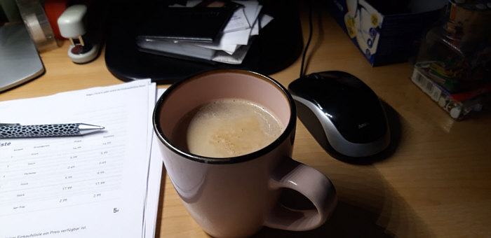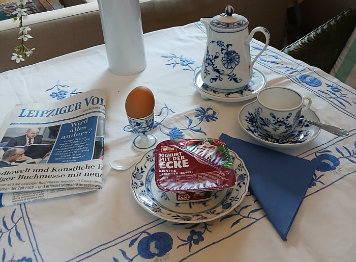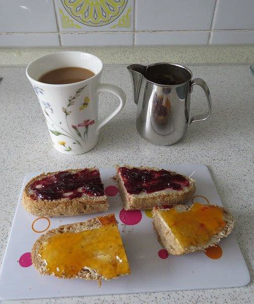 Willkommen beim Seelenfärbler-Frühstück Teil 2 (Teil 1 war hier) Inge-Lore ![]() Seit ich alleine frühstücke - und das seit über 30 Jahren - reicht mir ein Joghurt, heute ausnahmsweise ein Frühstücksei - und 2 Tassen Kaffee sind immer dabei. ~~**~~ Wolf-Dieter ![]() Mein Frühstück heute: Müsli mit Banane, Frischkäse, Ingwertee und Tabletten ;). ~~**~~ Maggi Ch ![]() Mein Lieblingsfrühstück wenn Toastbrot übrig ist. Brot, Schinken, Käse und Tomaten. Raclettegewürz darüber und ab damit für 2 Minuten in die Mikrowelle. Dazu gab es heute Papaya. ~~**~~ Therese ![]() Mein heutiges Frühstück: halbes Brot mit selbstgemachter Bärlauchbutter ( ... in der Bärlauchzeit, sonst belegt mit einer Scheibe Käse). Morgens mag ich weder Wurst noch süssen Belag. ~~**~~ Christine R. ![]() Ich frühstücke täglich um 8.00 Uhr immer alleine. 2 Tassen Kaffee, 1 Semmelhälfte mit Butter und Käse, die andere Butter und Marmelade. ~~**~~ Konny ![]() Mein Frühstück am PC, Pott Kaffee und das reicht mir. Wir essen meist pünktlich zu Mittag. ~~**~~ Anne ![]() Mein Nicht-Frühstück! Gewöhnlich trinke ich morgens nur einen Kaffee mit ein wenig Milch (in diesem Fall aus der Bochum-Tasse) und dabei schaue ich in den PC nach meinen Mails und natürlich nach Seelenfarben ;). ~~**~~ Lieschen ![]() Ich konnte noch nie ganz früh gleich nach dem Aufstehen groß frühstücken. Früher musste ich es tun, um nicht nüchtern zur Schule zu gehen. Später dann in der Arbeit, da ging ich nüchtern aus dem Haus und in der 1. Pause gab es dann ein kleines Frühstück. Das habe ich bis heute so bei behalten, nach dem Aufstehen räume ich erst noch was rum in der Wohnung, dann gibt es Kaffee und den Kornspitz. PS: ich stehe auch immer beim Frühstück. ~~**~~ Fortsetzung folgt ... :)). |