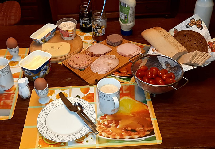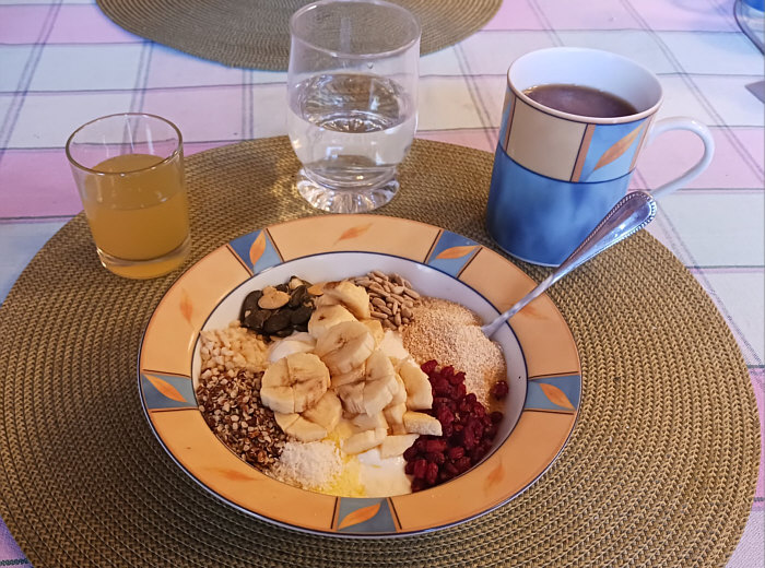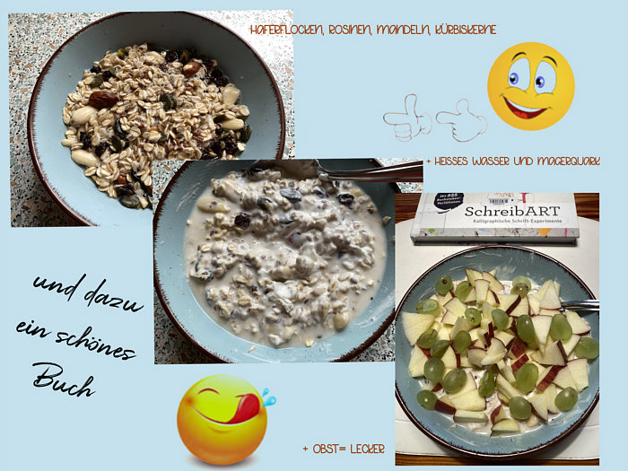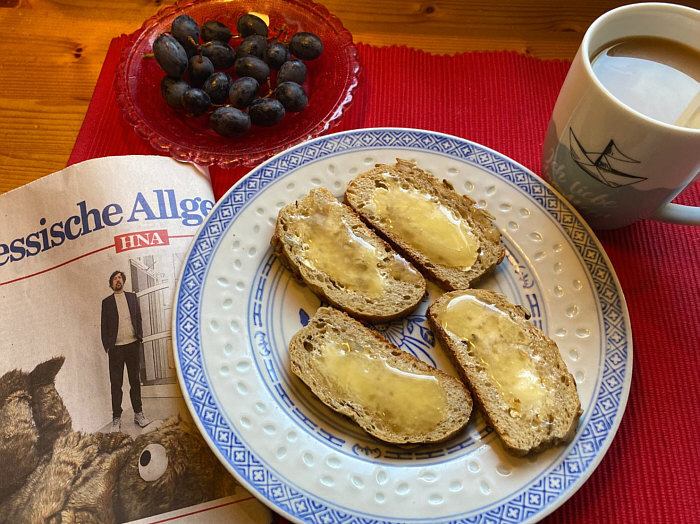Willkommen beim Seelenfärbler-Frühstück Teil 4 (Teil 1 war hier, Teil 2 hier, Teil 3 hier) Weiter geht es mit den "guten Morgen"-Essen der Seelenfärbler: Xenophora ![]() Brötchen, in Scheiben geschnitten, mit Butter und Honig, Kaffee und Weintrauben und die Tageszeitung. ~~**~~ Angelika V. ![]() Mein Frühstück ... enthält eingeweichte Haferflocken, Naturjoghurt, Leinöl, 1/2 Banane, 1/4 Apfel, Berberitzenbeeren, Mohnsamen, Kürbiskerne, Sonnenblumenkerne, Hanfsamen, Kokosflocken, Walnusskerne, geschrotete Leinsamen, Weizenkeime und Haferkleie. Dazu Ingwershot, Wasser und Kaffee mit Milch. Als mein Mann zur Reha war, war das jeden Tag mein Frühstück. Hält lange satt. Jetzt essen wir es mindestens drei Mal in der Woche, wenn mein Mann Frühdienst hat. ~~**~~ Margot ![]() Ein Glas warmes Wasser, Quark und am liebsten selbst gemachte Marmelade auf einer Scheibe Brot (war leider aus, daher das Glas Aprikosenmarmelade aus den Vorräten, das ich immer zum backen von Nussecken da habe). Heute gab es dazu einen von meinem Mann frisch gepressten Orangensaft von unseren Crowdfarming Apfelsinen. Zuckersüß! Dazu einen kräftigen schwarzen Kaffee! ~~**~~ Gitta ![]() Freitags ist mein Porridge-Tag. Eine fertige Porridge-Mischung, 1 Esslöffel Haferkleie dazu, heiße Hafermilch, gewürzt mit Zimt, Kurkuma, Galgant, Muskatblüte, Lavendelblüten (das ist eine fertige Bio- Gewürzmischung) und eine kleine Handvoll Blaubeeren und Walnüsse. Dazu ein großer Becher Kaffee. Das kommt auf ein Tablett und ich nehme es mit zu meinem gemütlichen Sessel im Wohnzimmer. ~~**~~ KoRa ![]() Mein Frühstück besteht täglich (außer am Wochenende) aus einem Schüsselchen mit groben Haferflocken, gemischt mit Rosinen, Mandeln, Kürbiskernen, aufgegossen mit heißem Wasser. Darein wird Quark gemischt, bis alles eine schön schlonzige Konsistenz hat. Und darauf kommt dann Obst nach Wahl. ~~**~~ Birgit57 5 Varianten des Frühstücks ![]() Heute ein deftiges Frühstück mit einer Scheibe Roggenbrot, etwas Remoulade als Aufstrich, 2 gerührten Eiern und Tomaten. Dazu wie immer eine große Tasse Kaffee. ![]() Und heute was Süßes. Quark mit Banane, Mandelmilch, Haferflocken und etwas Honig, darüber 3 Löffel TK-Beeren-Mischung. Dazu der übliche Kaffee. ![]() Heute habe ich Ciabatta aufgebacken und einmal mit Remoulade und Kasseleraufschnitt und die andere Hälfte mit Holundergelee und Käse gegessen. Und ein Kaffeepott. ![]() Sonntags wird's etwas üppiger. ![]() Es gibt auch mal nur ein kleines Frühstück. ~~**~~ Eine Fortsetzung gibts noch ... es können also noch Bilder nachgereicht werden ... :)). |
