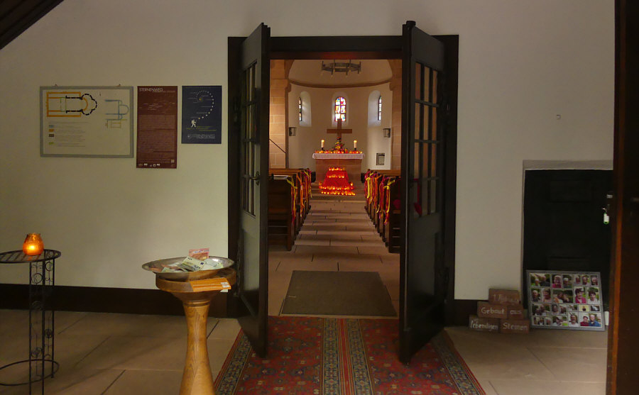 Wir sind heute dort ... ![]() ... wo Gottes Sonne die Rosen zum Leuchten bringt. Die Rosen stehen in der Nähe einer der vielen Häuser des Herrn ... ![]() ... und er muss hier ab und zu wohnen, denn das hier ... ![]() ... kann doch nur ein Zeichen von Stärke, Kraft und Zuversicht sein. ![]() Neben der Kirche steht ein alter Lindenbaum ... ![]() ... und nun gehen wir mal in das Gotteshaus hinein. ![]() Drinnen brennen Lichter ... ![]() ... es muss ein besonderer Tag sein. ![]() Wir feiern heute den Gedanken zur der "weltweiten Einigung und Zusammenarbeit der verschiedenen Konfessionen" ... der Ökumene. Denn gleich findet hier ... ![]() ... für eine halbe Stunde ein ökumenisches Zusammensein bei Taizé-Gesängen ... ![]() ... und vielen Lichtern statt. Willkommen in der Sonntagskirche von Seelenfarben :)). Deine Gedanken zur Kirche und zum Innenraum ? |