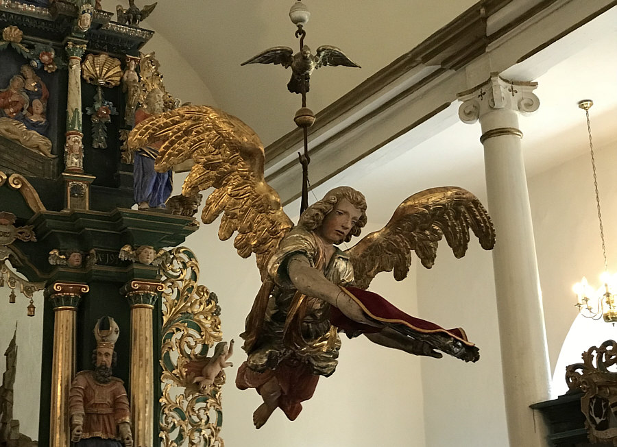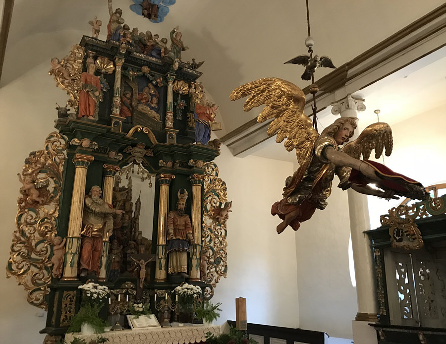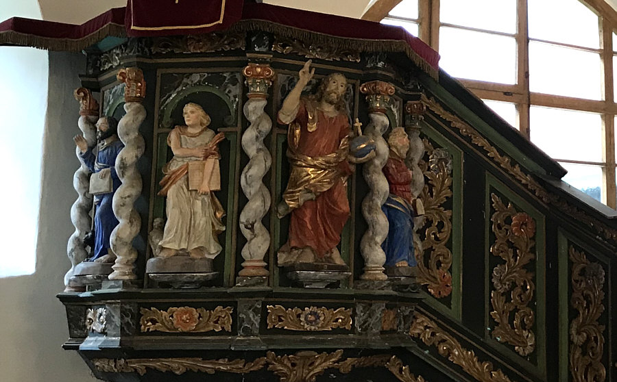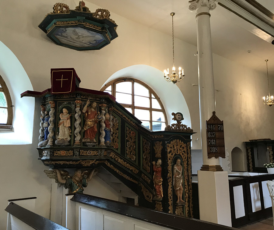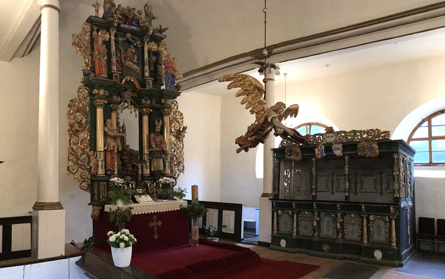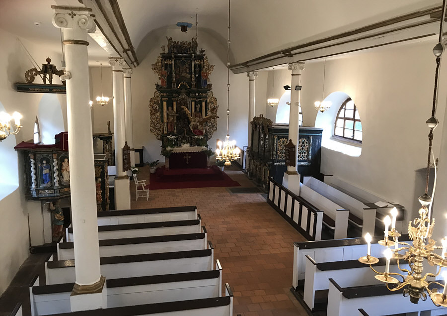 Wir sind heute in der evangelisch-augsburgischen Kirche in Sorkwity, die ein Bauwerk aus dem 16. und 17. Jahrhundert ist. Bis heute ist sie ein evangelisches Kirchengebäude, das als Pfarrkirche im einst ostpreußischen Kirchspiel Sorquitten diente und jetzt zentrale Gottesdienststätte der Pfarrei Sorkwity in der polnischen Diözese Masuren ist. ![]() ![]() ![]() Der Westturm mit verblendetem Ziegelmauerwerk entstand erst 1701 bis 1721. Er trägt ein Zeltdach mit einer Wetterfahne von 1777 ... ![]() ... zur Erinnerung an die Umbauarbeiten im Jahr 1776/77. Damals musste der marode obere Teil um 35 Fuß abgetragen werden. Er wurde dann so hergerichtet, wie er heute noch steht. Der Kircheninnenraum erhielt 1754 im Mittelschiff ein Tonnengewölbe und an den Seiten flache Bretterdecken. Außerdem wurden die halbrunden Fenster eingesetzt Seither ist das Erscheinungsbild der Kirche unverändert geblieben. ![]() Die Kircheninnenausstattung trägt im Wesentlichen die Handschrift von Isaak Riga. Sie gilt "als ein Kleinod bäuerlicher Kirchenkunst". Die von Riga umgestaltete Kanzel von 1694 ist mit Figuren in bäuerlicher Tracht verziert ... ![]() ... ebenso der schwebende Taufengel von 1701. ![]() Den Altar ... ![]() ... im Stil der Spätrenaissance aus Holz fügte Friedrich Pfeffer aus Königsberg 1715 aus einem alten, von Christoph Billich und Martin Lange geschnitzten Altar zusammen. Unter dem Altar befindet sich eine 1936 wiederentdeckte Gruft mit Särgen. ![]() Das Patronatsgestühl entstand um 1615/17 im Stil der Spätrenaissance. Die Orgel ... ![]() Die Orgel aus dem Jahr 1876 ist ein Werk (Opus 212) des Orgelbaumeisters Wilhelm Sauer aus Frankfurt (Oder). Sie wurde 2010 von der Orgelwerkstatt Christian Scheffler aus Sieversdorf restauriert und wieder spielbar gemacht. ![]() Der warme, differenzierte Klang der Orgel ist von der Romantik des 19. Jahrhunderts geprägt. ![]() Weitere Bilder, damit man ein Gefühl vom Innenraum der Kirche bekommt: ![]() ![]() ![]() Willkommen in der Sonntagskirche von Seelenfarben :)). Deine Gedanken zur Kirche und zum Innenraum ? |