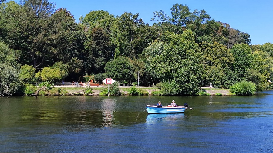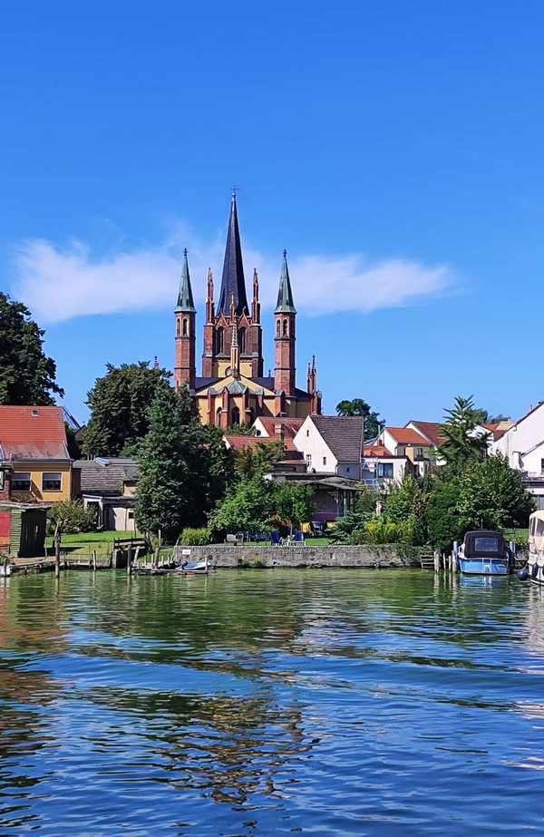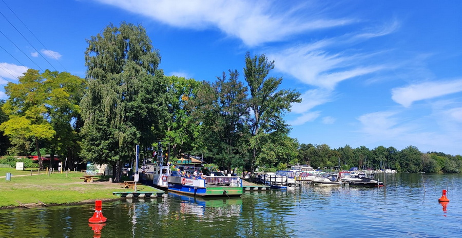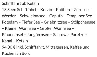In dieser Woche gehen wir mal ein bisschen vor die Tür. Kalenderblatt unterwegs ist das Motto. Wir werden Dinge sehen, die wir sonst nicht sehen würden. Und diese Dinge sind gar nicht weit weg ... wir machen keine Weltreise, sondern nur einen Ausflug. Heute 13-Seen-Rundfahrt ab Ketzin Wir sind also auf der Havel und ihren Seen unterwegs. Die Route: ![]() Die Karte (ich hab mal die Route in die Karte eingezeichnet): ![]() Sylvi ist mitgefahren und hat uns viele Bilder mitgebracht. 5 Stunden hat diese Fahrt gedauert. Sie hatte die Bilder im Status ohne weitere Angaben, welcher See das jeweils ist. Macht ja niemand, wenn er über 40 Bilder in den Status macht, bei jedem Bild etwas dazu zu schreiben. Doch es wäre schwierig gewesen, die Bilder ohne Text zu zeigen, weil sie alle ähnlich sind ... logischerweise oft Wasser, Ufer, Gebäude. Darum habe ich gefragt: "welches Bild welchen See zeigt, weißt du nicht". Daraufhin gab es dieses Gespräch per Whatsapp ... links Sylvi, rechts ich: ![]() So sah die Mail aus: ![]() So ... jetzt gehts los, wir gehen aufs Schiff: ![]() Havel bei Ketzin mit dem FGS "Harmonie" Baujahr 1926 auf der Werft Brink/Wiesen in Königswinter Mit diesem Schiff fuhren wir dann auch 6 Stunden mit Mittagessen und Kaffee. ![]() Ketzin an der Havel mit Ev. Kirche St. Petri ![]() Fähre Ketzin - Übersetzung zum Havelradweg und umgekehrt ![]() Kleiner Zernsee ![]() Blick auf Werder Insel mit Hafen und Uferpromenade ![]() Werder Insel mit der Heilig-Geist-Kirche ![]() FGS "Belvedere" erbaut 2006 auf der Schiffswerft Bolle ![]() Dorfkirche in Geltow am Schwielowsee mit sehr schönem Dach ![]() FGS "Schwielowsee" erbaut 2019 auf der Schiffswerft Bolle (fährt schon teilweise elektrisch) ![]() Precise Resort Schwielowsee ![]() Einfahrt in das Caputher Gemünde ![]() Seeschlösschen "Seebad Caputh" am Caputher Gemünde ![]() Eisenbahnbrücke Potsdam-Belzig erbaut 1908 ![]() Seilfähre über das Caputher Gemünde ![]() Templiner See ![]() Halbinsel Hermanswerder zwischen Havel und Templiner See mit dem Wasserturm ![]() Landeshauptstadt von Brandenburg- Potsdam in Sicht ![]() Potsdam Garnisonskirche im Hintergrund am Templiner See ![]() Blick auf St. Nikolai erbaut 1850 nach Plänen von Friedrich Schinkel ![]() Im Hintergrund FGS "Königswald" erbaut 1970 und zwei zusammengebundene Flöße ![]() Im Hintergrund St. Nikolai und vorn Landtagsneubau am einem der Potsdamer Häfen [ morgen fahren wir weiter ] |