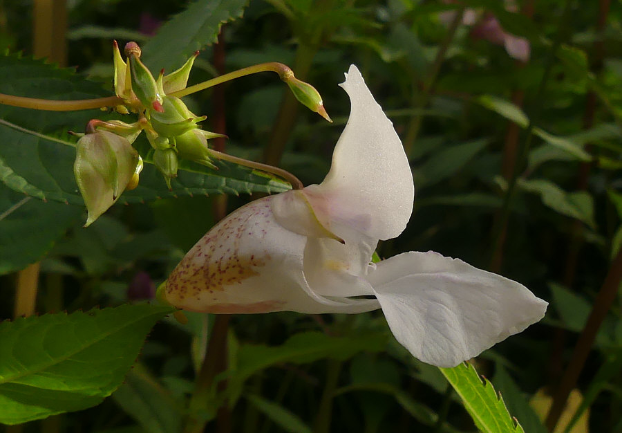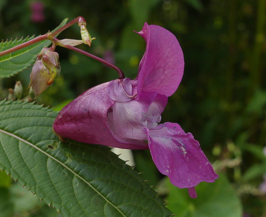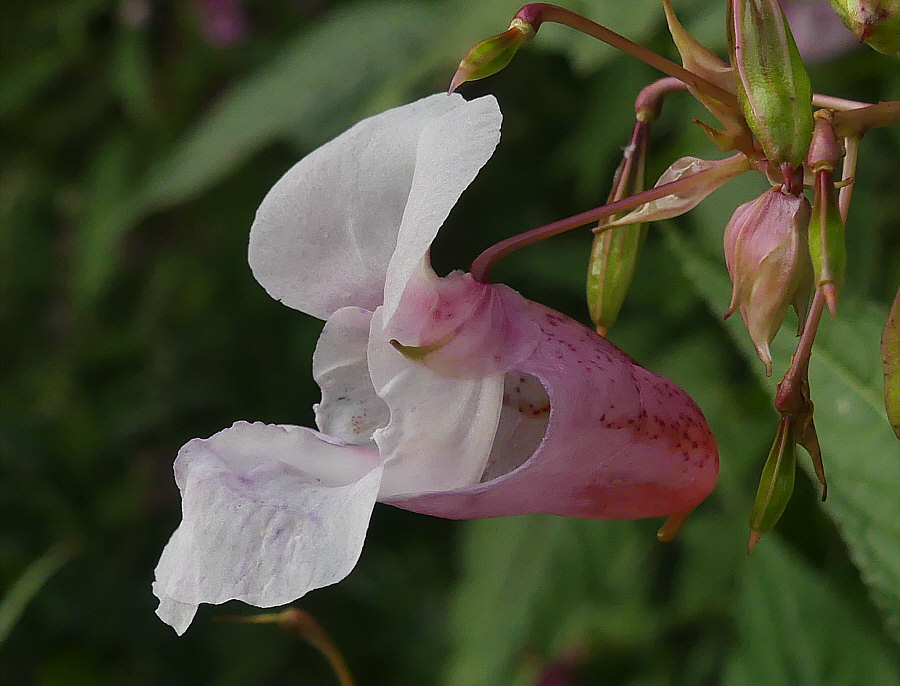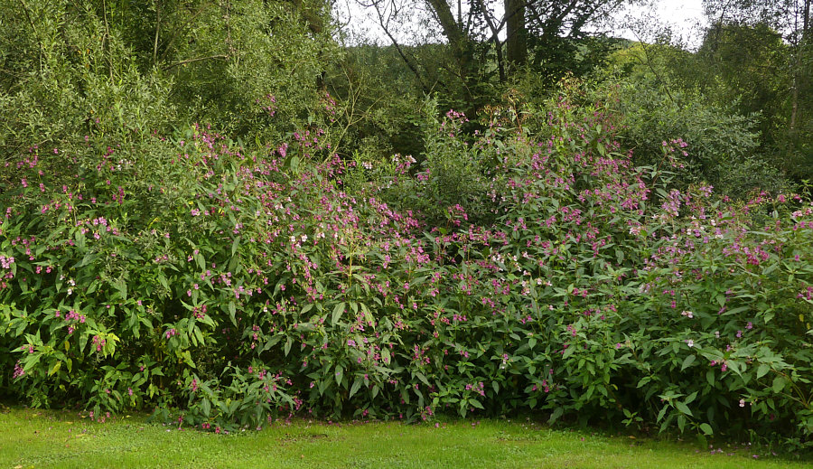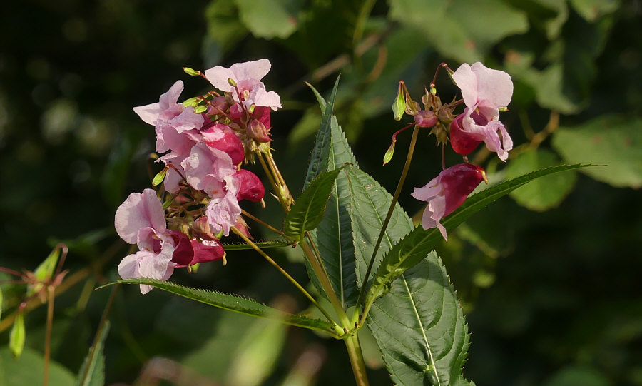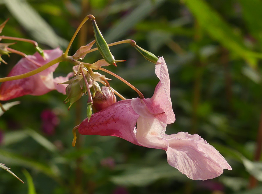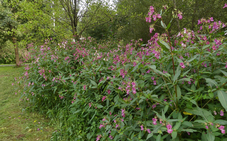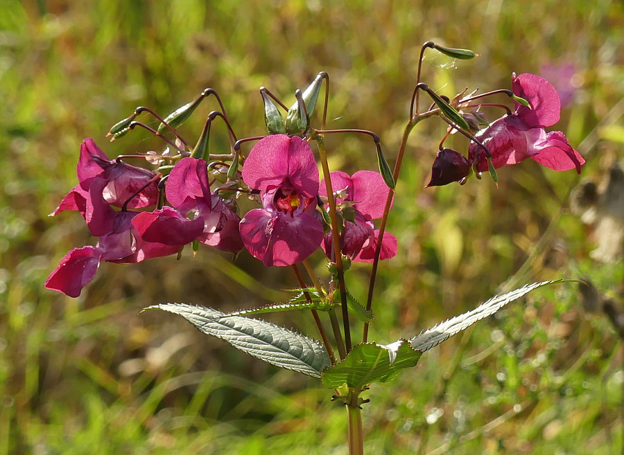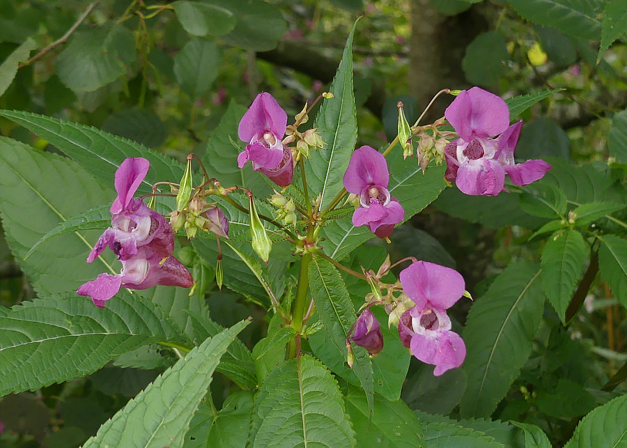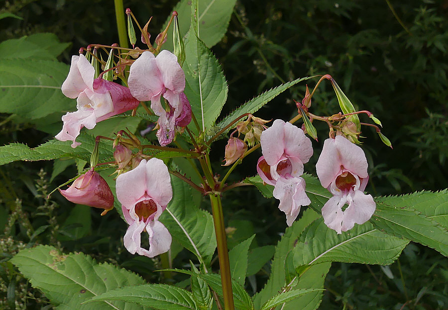 Das Drüsige Springkraut (oft auch Indisches Springkraut, Rotes Springkraut oder Himalaya-Balsamine geannt), früher auch Bauernorchidee oder Riesenbalsamine ... kommt eigentlich aus Indien, wurde aber als Zierpflanze im 19. Jahrhundert auch in Nordamerika und Europa eingebürgert. Es wächst in Mitteleuropa vor allem in feuchten Wäldern, Auen- und Uferlandschaften mit hohem Nährstoffgehalt. In Europa wird das Drüsige Springkraut vielerorts als invasiver Neophyt bekämpft, da es als Bedrohung für andere Pflanzenarten oder ganze Pflanzengesellschaften in deren Lebensraum betrachtet wird. Speziell an Ufern von Flüssen wächst nichts anderes mehr als Springkraut. Auf der anderen Seite ist die Blume eine wertvolle Bienenweide im Herbst. Heute solls eh nur um die Blüten gehen, denn sie sind sehr interessant geformt ... ich hatte am Ufer der Nahe ... ![]() ![]() ... Gelegenheit zum Fotografieren: ![]() ![]() ![]() ![]() ![]() ![]() ![]() ![]()