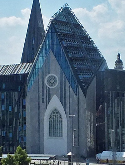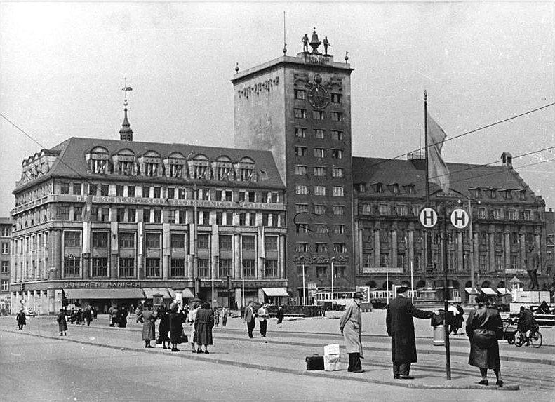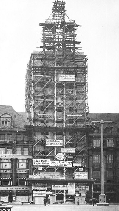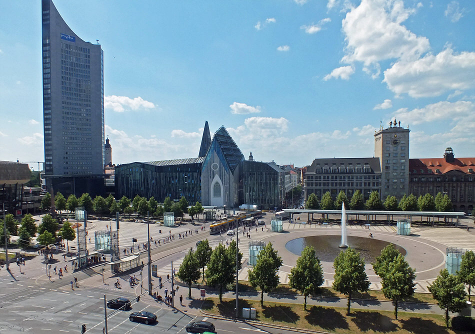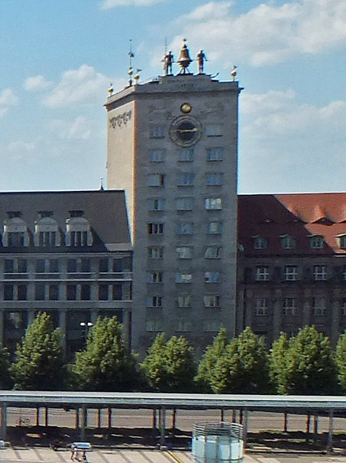 Eigentlich wollte ich heute mal wieder Postgebäude zeigen ... ... diesmal im Osten ... nachdem ich ja schon welche aus Nordrhein-Westfalen gezeigt hatte, sollte die Reise jetzt nach Sachsen gehen ... aber ... ... es kam irgendwie anders. Wir sind in Leipzig ... die Hauptpost steht am Augustusplatz. Also schaue ich mir den Platz mal an: ![]() Nun ... die Post ist hier gar nicht drauf. Denn das hier ist die Westseite des Platzes, die Post steht an der Ostseite .. von dort aus dürfte das Bild gemacht worden. Der Augustusplatz zählt als einer der schönsten Plätze in Deutschland. Und alleine auf dieser Westseite gibt es so viel zu sehen, dass ich hier hängen geblieben bin. Ich könnte zu jedem dieser Gebäude ein ganzes Kalenderblatt machen. Also musste ich mich erstmal für eines entscheiden. ![]() Ganz links steht das City-Hochhaus, das mit seinen 34 Etagen ein Wahrzeichen der Stadt und mit 142,5 Metern das höchste Gebäude Leipzigs ist. Bei seiner Fertigstellung 1972 war es auch das höchste Gebäude deutschlandweit. Aber um dieses Gebäude geht es heute nicht. Weiter rechts steht das ... ![]() ... Augusteum. Das Neue Augusteum ist das Hauptgebäude der Universität Leipzig. Es entstand im Rahmen des Campus-Neubaus zwischen 2007 und 2012. Aber um dieses Gebäude geht es heute nicht. Das Neue Augusteum grenzt an den Neubau des ... ![]() ... Paulinums ... das ist Aula und Universitätskirche St. Pauli gleichermaßen. und das geistige und geistliche Zentrum der Universität. Aber um dieses Gebäude geht es heute nicht. Rechts im Bild ist das ... ![]() ... Krochhochhaus ... und um dieses eher unscheinbare Gebäude geht es heute. Kroch ist der Name des Inhabers einer Privatbank ... für diese Bank wurde im Jahr 1927/28 diese Haus gebaut ... es war das erste Hochhaus der Stadt. Ab wann ist denn ein Haus ein Hochhaus ? Wenn der Boden eines Raumes für den Aufenthalt von Menschen höher als 22 Meter über dem Boden liegt. Ab 150 Metern sagt man dann Wolkenkratzer, das nur am Rande ... ... denn an diesen flauschigen weißen Dingern kratzt das Haus nun doch nicht. Das war damals ein Drama mit diesem Haus. Es fing harmlos an ... es gab einen Wettbewerb für den Bau. Man konnte sich nicht auf einen Sieger einigen und so gab es zwei zweite Plätze. 69 Vorschläge waren es, man entschied sich für den von Herrn Bestelmeyer. Und der hatte dieses Haus im Kopf: ![]() Das ist der 1496-1499 erbaute Uhrturm "Torre dell'orologio" am Markusplatz in Venedig. Der geisterte in Bestelmeyers Kopf rum und so entstand seine Idee eines ähnlichen Hauses für die Ausschreibung. Nur ... dieses neue Haus in Leipzig sollte 43 Meter hoch werden. Ein Schrei hallte durch die Bürger der Stadt, es gab doch eine Vorschrift, dass sämtliche Neubauten in der Innenstadt die Firsthöhe der bereits bestehenden Bauten nicht überschreiten dürfen ... und schon gar nicht ein Privatbau. Nee, das wollemernicht. Und so konzipierte der Architekt die obersten vier Etagen erstmal als Attrappe. Also erstmal 7 Geschosse fertig und 4 als "so tun als ob". Erstmal gucken, wie das dann aussieht. Das sah dann doch okay aus ... darf doch so bleiben und so wurde das dann doch 43 hohe Haus gebaut ... ... hier ein Bild von der Baustelle am 20. Juli 1928: ![]() Wir werfen mal einen Blick auf den Schilderwald: ![]() Und so wurde das Krochhochhaus das erste Hochhaus der Stadt und zugleich das erste private Bankgebäude in dieser Größe in Deutschland. Und ab sofort eines der Wahrzeichen von Leipzig. Das war auch der Beginn des Hochhausbaus in der Stadt. Zurück zum Uhrturm in Venedig ... dort sind oben auf dem Dach ... ![]() ... zwei bronzene Glockenschläger. Sowas musste natürlich auch auf das Haus in Leipzig drauf: ![]() Das war damals das größte Turmschlagwerk der Welt. Die große Glocke wird vom rechten Glockenmann zu jeder vollen Stunde geschlagen, die mittlere Glocke vom linken Glockenmann alle Viertelstunde. Die kleine Glocke kündigt den Viertelstundenschlag an und wird von innen angeschlagen. 1955 sah das Haus so aus: ![]() Was jetzt nicht ganz so kunstvoll wie in Venedig umgesetzt wurde ... ![]() ... ist die kunstvolle Uhr mit den Sternzeichen und der Löwe. Das findet sich nur ansatzweise im Leipziger Gebäude wieder: ![]() Aber Löwen und die Anzeige der Mondphasen gibt es hier auch. 1963 gab es sogar eine Briefmarke mit dem Krochhochhaus drauf: ![]() 2008 wurde das Gebäude saniert. Heute sind in diesem Haus zu finden: das Ägyptologische Institut, das Altorientalische Institut mit einer Bibliothek, das Spracheninstitut der Universität Leipzig. und das Ägyptische Museum der Universität Leipzig. Ähhm ja ... ich wollte ja eigentlich die Post zeigen ... so kanns gehen ;)). |