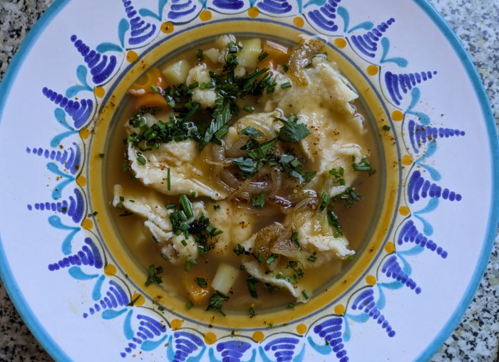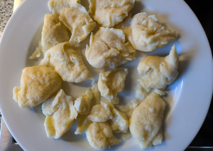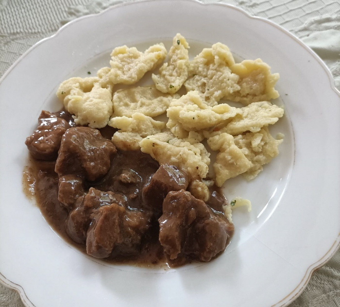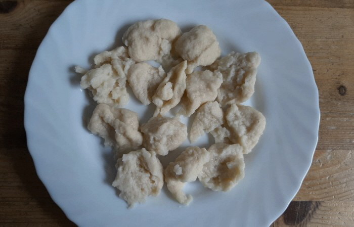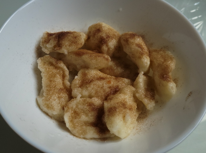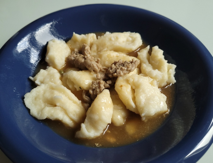 Verschiedene Worte für das gleiche Dingens: Kneppcher, Mehlknepp, Mehlklößchen, Mehlspatzen, Wasserspatzen Das Rezept dafür steht unter der Kommentarfunktion. Es stand auch im Tagebuch und es gab ja die Mitmachaktion. Heute ist also der Kneppchestag Acht Seelenfärbler haben mitgemacht ... die Bilder und Texte dazu zeige ich heute: Christa ![]() Vielen Dank für die Anregung. In Berlin sagt man Eierklößchen dazu. Da wir ja keine Spätzle machen, ist das eine andere Variante in Teig. Wir essen sie so als Ersatz für Kartoffeln, Klöße oder eben Spätzle, Aber auch in Brühe oder im Eintopf. Außerdem werden die übrig gebliebenen mit Ei gebraten. Ich habe sie heute schnell zu Gulasch gemacht und schicke Dir ein Bild. Regina aus Berlin ![]() Lieber Engelbert, ich habe gerade die Knuppersche probiert. Nach deiner Anleitung sind sie prima geworden. ![]() Die Hälfte gab es gerade bei mir zum Mittag mit Gulasch und Mischgemüse. Ich habe die Teigmenge für eine Person mit einem Ei gemacht. Ging super. Christine b ![]() Habe gleich gestern die Kneppcher = Mehlnockerl gemacht ... zum Fisolengulasch (Bohnengulasch). Da ich die Nockerl mit Buchweizen- und Dinkelmehl machte, sind sie dunkler. Mir schmecken Spätzle besser als die Kneppcher. Engelbert ![]() Einmal mit Hackfleisch-Pfeffer-Soße. ![]() Und einmal mit Zucker und Zimt. ReginaE Kreppsche habe ich zum ersten Mal gemacht. Ich schabe gerne Spätzle etwas dicker, die sind dann länger. Was auch geht, in die Masse klein geschnittene gerauchte Schinkenwurst rein und dann ähnlich wie die Kreppsche in Salzwasser gegart. Ich brate sie nochmals kurz an und dazu gibt es Salat. Es ist so etwas wie ein Wohlfühlessen :). ![]() So sehen die Kreppsche bei einer Menge von zwei Eiern aus. ![]() Und knapp die Hälfte in einer Gemüsesuppe auf einem tiefen Teller. Verwendet habe ich Rosenmehl Wiener Griesler. Chispeante ![]() Speisen mit vielen Zutaten sind für mich immer eine Herausforderung (viele = mehr als 1 Zutat). Aber ich weiß zufällig wie der Spätzleteig sein muss und die Knepp sind top geworden!!! Schnecke ![]() Hier meine Kneppches aus Dinkelmehl als Suppe... hat mich an Grießnockerl erinnert, nur dass ich da statt Milch noch etwas Backpulver und Butter reintue. Durch den Dinkel etwas "kernig", naja, Grießnocken mag ich lieber ... Oktoberfee ![]() Sie sind mir gut gelungen und haben gut geschmeckt, was für mich keine Überraschung war. Die Mehlknepp sind den fränkischen Mehlklößen sehr ähnlich. Bei Letzteren kommt in den Teig noch geröstetes Knödelbrot hinein und sie werden mit einem Eßlöffel abgestochen. Aber ansonsten die gleiche Vorgehensweise. Dazu gab es ausgelöstes und gebratenes Hähnchenschenkelfleisch in Pfeffersoße mit frischem grünen Pfeffer. Insgesamt ein gutes Gericht das ich bestimmt noch öfter machen werde. ![]() Den Rest hab ich in der Pfanne gebraten und mit Pfefferbrösel bestreut. Sind ein bißchen dunkel geworden schmecken aber köstlich. Dazu gab‘s das restliche Huhn in Pfeffersoße. Branwen ![]() Weil noch Soße von den Rouladen übrig war, hab ich heute Abend die Mehlknepp ausprobiert. Hatte ich ja noch nie gegessen. War lecker und ich kann mir vorstellen, dass sie zu Gulasch sehr gut schmecken. ![]() Und weil ich neugierig war, hab ich sie dann gleich noch mit Zimtzucker probiert. Ich wünschte, ich hätte noch heiße Kirschen dazu gehabt. Auch lecker. Hab ich bestimmt nicht zum letzten Mal gemacht.