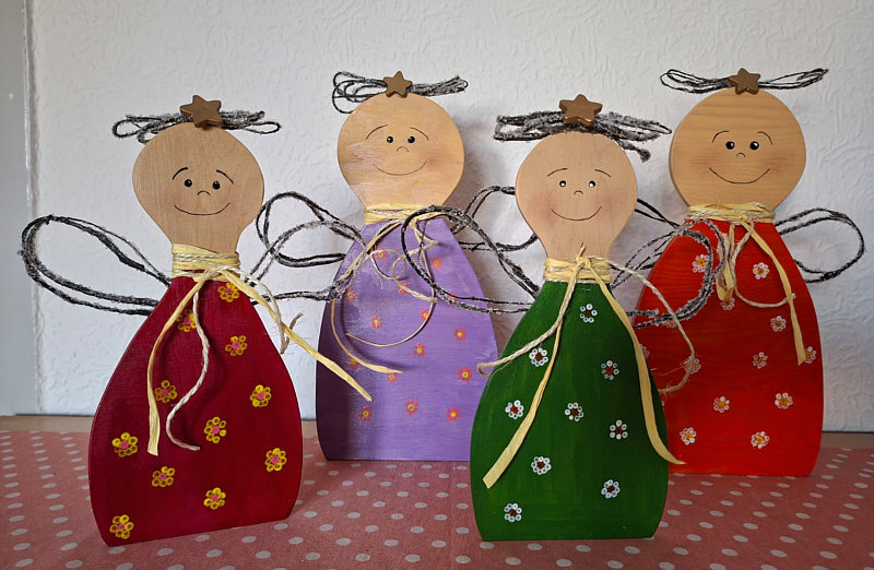Er hat die Engel ausgesägt, Birgit hat dann weiter gebastelt.