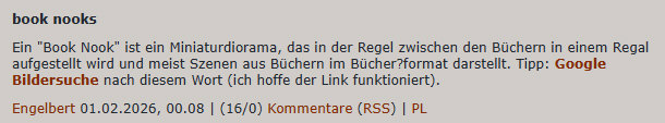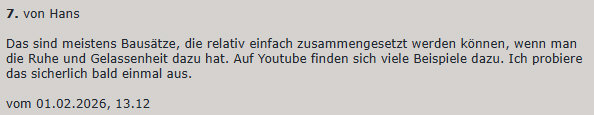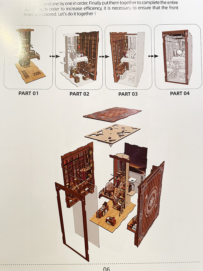 Das war mein Tagebucheintrag vom ... ![]() ... 1. Februar ... es gab gemischte Kommentare von meinen Lesern. Von wunderschön bis Kitsch, von hübsch bis hässlich. Auch Hans hatte kommentiert: ![]() Und dieses "bald" war dann schon 3 Tage später ... so schnell kanns gehen ;)). Hans hat das alles mit der Kamera begleitet, so dass wir den Zusammenbau dieses Book Nook so verfolgen können, als würden wir Hans über die Schulter schauen. Hans zeigt und schreibt: ![]() Das Book Nook ist da! Das Paket hatte immerhin gute 1.600 Gramm, ist also kein Leichtgewicht. Aber da viel Holz dabei ist, wundert das auch nicht. Und ja – natürlich – es kommt aus China. ![]() Die Plastikverpackung ist entfernt und es kommt der Inhalt innerhalb eines weißen Kartons zum Vorschein. Gut gelagert und ohne Schaden scheint alles da zu sein. ![]() Die Holzbauteile links, Elektro-Anlage oben, genauso wie eine Pinzette, Kleber und anderes Material. Rechts die Bauanleitung und unten die ganzen Aufkleber. ![]() Die Bedienungsanleitung ist zum Glück nicht nur auf Chinesisch. Mein Bauanleitungen-Englisch ist zwar auch nicht das Beste, aber im Zweifel hilft Google. ![]() Viel Holz, viele Bauteile, aber alle gut erkennbar nummeriert und die einzelnen Platten sind mit Buchstaben versehen. ![]() Das also sind die vier Bauphasen. Mal sehen, ob es gelingt. ![]() Die ersten Schritte und die ersten aufgeklebten Bildchen. (Ich habe prompt eines übersehen, macht aber nichts). Die Pinzette ist hier manchmal schon von Nöten. ![]() Ein Vergleich mit einem Cent-Stück zeigt, dass man hier auch diffizil arbeiten muss. ~~**~~ Ähmm ... ehrlich ... das wäre nichts für mich. Da werde ich beim Hinschauen schon fast nervös. Aber ich bewundere Hans, dass er sich dieser Aufgabe widmet. Und ich bin sehr gespannt, wie es weiter geht ... wird natürlich fortgesetzt. |