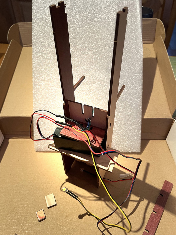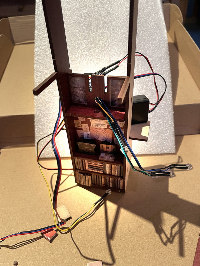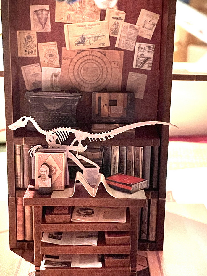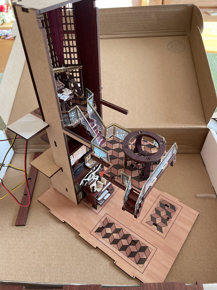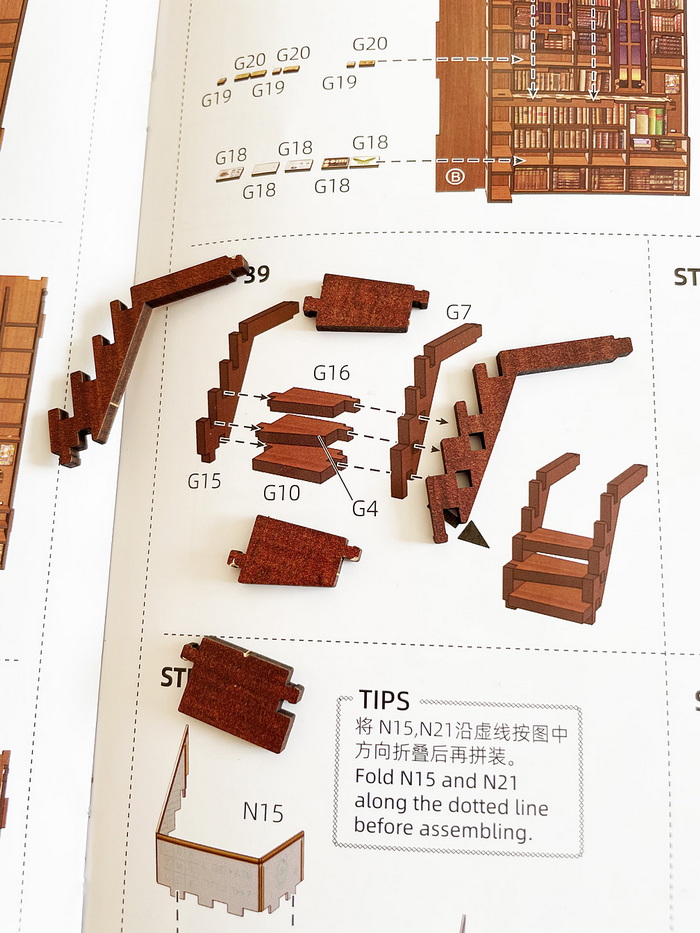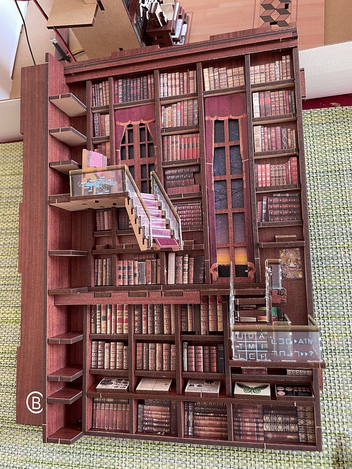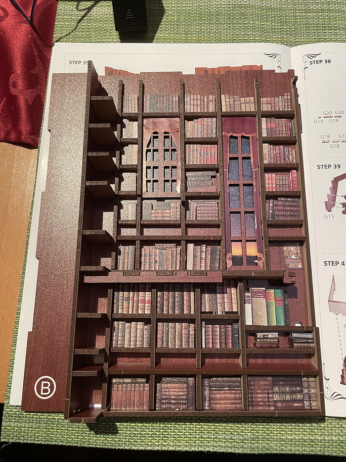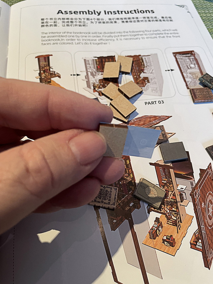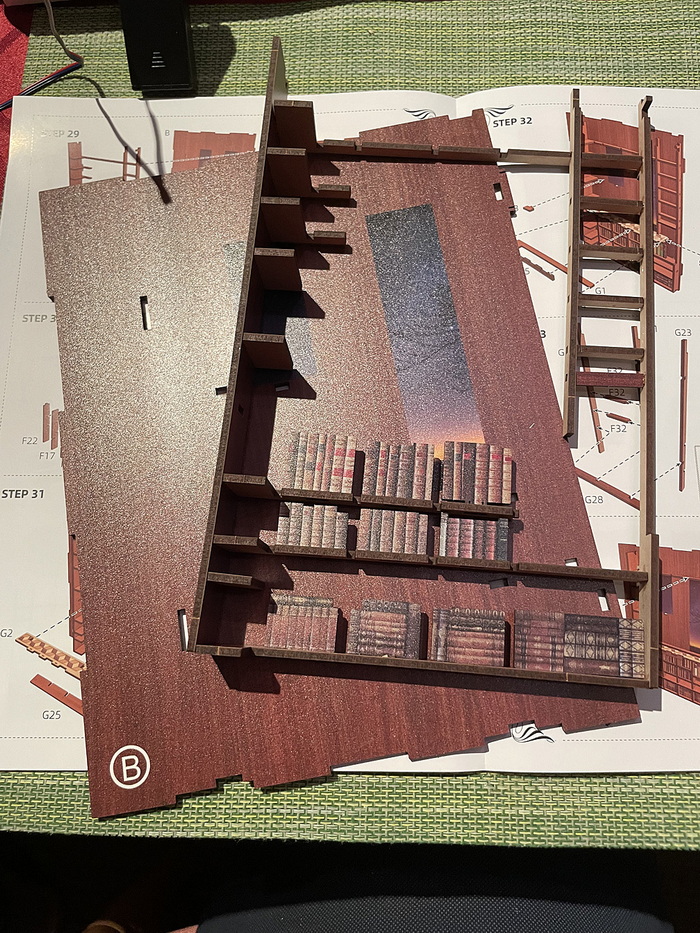 Hans ![]() ... baut ein ... ![]() Book Nook zusammen und wir dürfen dabei sein. Folge 2 (Folge 1) ![]() Jetzt bin ich schon etwas weiter. Die Holzbauteile lassen sich fast alle gut für einen festen Halt zusammenstecken, Klebstoff ist selten nötig. ![]() Ach ja, die Bücher! Sie werden mich noch beschäftigen. Man „macht“ sie sozusagen aus einem Holzplättchen (in je zwei Größen und je zwei Arten vorhanden) und jeweils einem Aufklebebildchen, das man passgenau auf der einen Seite aufbringt und dann auf die andere Seite umknickt. So sieht das Holzstückchen dann aus wie ein kleines Buch mit Buchrücken. ![]() Hier sind schon mal einige davon zu sehen. Ein kleines und ein großes Buch im Vergleich zum Cent-Stück. Ca. 200 Stück (!) werden gebraucht. ![]() Phase 1 mit eingebauter Elektrik von der Rückseite ... ![]() ... und von der Vorderseite. ![]() Viele Kleinteile sind schon untergebracht. Der Saurier war zum Glück schon ganz ;). (Und sogar sicherheitshalber 2-fach vorhanden.) ![]() Anfang Phase 2: Hintergrund und erste Regalbretter. ![]() Noch mehr Bretter, eingeklebte Buchattrappen und Vorhänge haben wir auch schon. ![]() Beim Zusammenbau ist es manchmal angebracht, die ausgetrennten Teile so hinzulegen, wie sie in der Anleitung dargestellt sind, damit man sie nicht falsch einbaut. ![]() Phase 2 fast fertig, links müssen noch ca. 80 Bücher eingeklebt werden. Unangenehm zum Verarbeiten sind die "gläsernen" Geländer, die aus Plastik sind und geknickt werden müssen. Die Stecker davon gehen schnell kaputt und dann hilft nur mehr kleben. ![]() Auch Phase 1 ist nun fast ganz fertig. [ wird fortgesetzt ] |