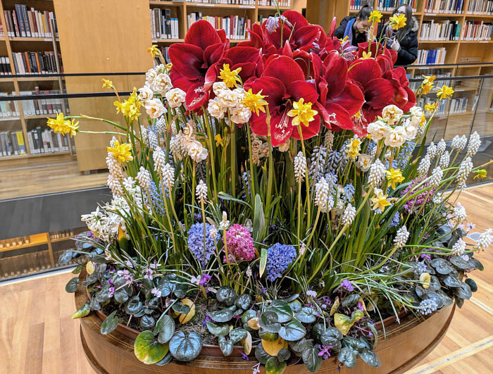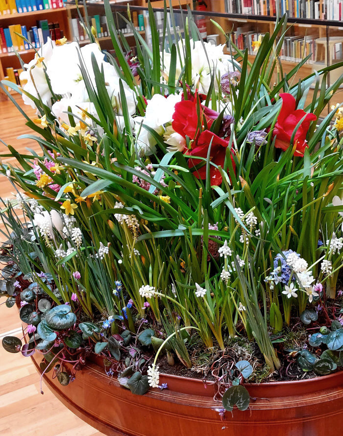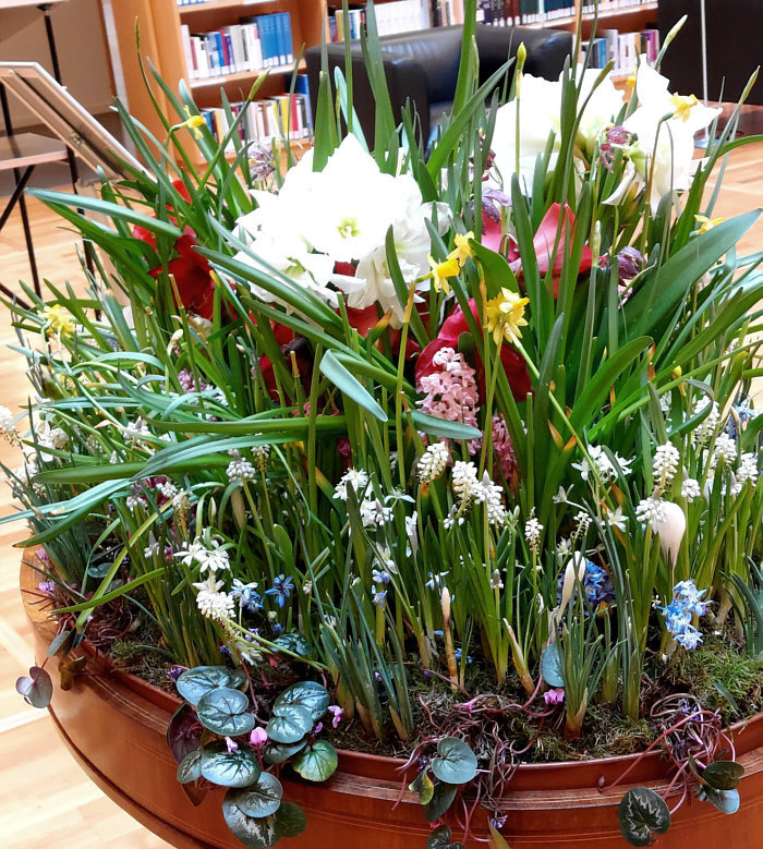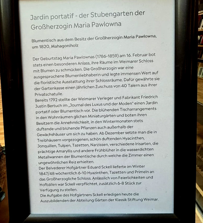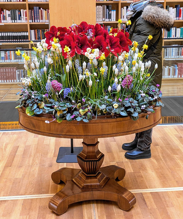 der Stubengarten Sywe war in der Herzogin-Anna-Amalia-Bibliothek in Weimar. Gegründet wurde sie schon 1691. Berühmt ist ihr ovaler und über drei Geschosse reichender Rokokosaal. Seit 1998 gehört sie als Teil des Ensembles "Klassisches Weimar" zum UNESCO-Welterbe. In dieser Bibiliothek findet sich ab jedem Februar auch dieses schönes Stück: ![]() Das ist der "Stubengarten". ![]() Ein Schild gibt uns weitere Informationen: ![]() Und so dürfen die Besucher der Bibliothek in jedem Jahr diesen Blumenschatz begrüßen. Die oberen Bilder sind von diesem Jahr ... 2022 sah der Tisch so aus: ![]() ![]() Ich kann auch noch ein Bild von 2019 zeigen: ![]() Als Zusatzbild zeige ich noch ein Wikipediabild ... das ist der über drei Stockwerke reichende Rokoko-Saal: ![]() |