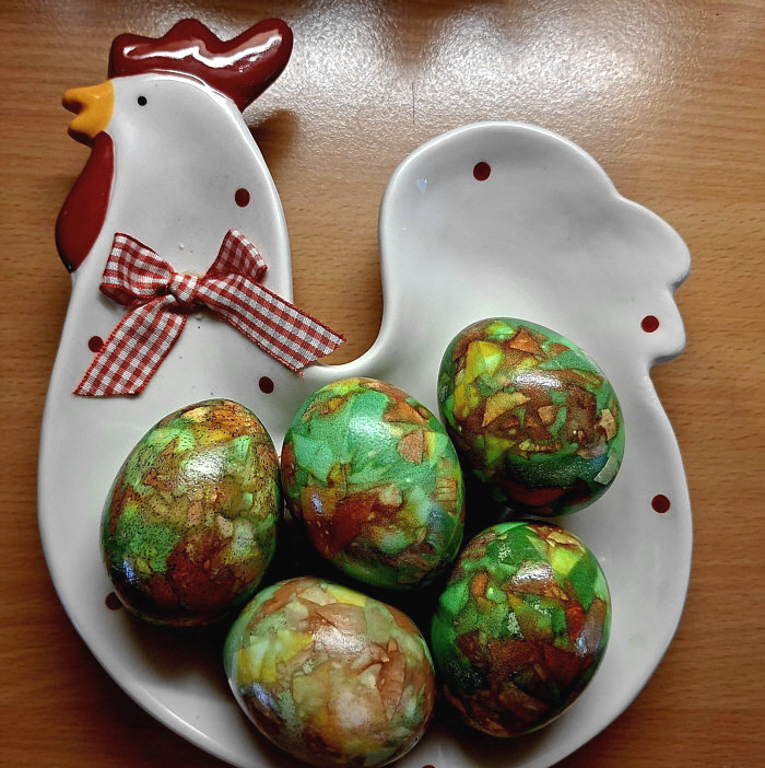 Ostereier färben mit Petra H. Man nehme - Zwiebelschalen, die in kleine Stücke geschnitten wurden Das können normale Zwiebeln sein, aber eine rote Zwiebel dabei ist auch toll. - kleine weiße Papierstücke ![]() - einen Strumpf, der zerschnitten wird - und natürlich Eier ![]() Das rohe Ei wird kurz ins Wasser getaucht und dann in den Schalen gewälzt. Dann in Gaze oder einen zerschnittenen Feinstrumpf gewickelt und zugeknotet. ![]() Ab damit auf den Herd. In kaltem Wasser ansetzen und 5 Minuten kochen. Je nach Farbwunsch kann man noch Ostereierfarbe ins Kochwasser geben.