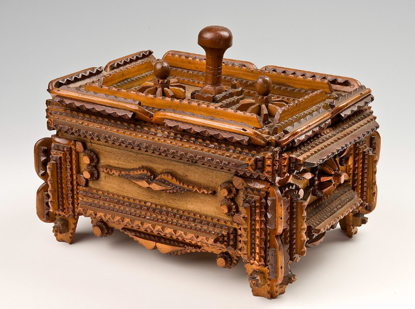 ![]() Das ist Tramp Art (auf deutsch übersetzt: Landstreicherkunst) So nennt man einen Stil der Holzverarbeitung, der ab 1850 vorwiegend in den USA aufkam und bis in die 40er Jahre anhielt. Das ist Kerbschnitzerei ... und in vielen Fällen die Wiederverwendung von Zigarrenkisten (manchmal auch Transportkisten). Das war billiges, leicht verfügbares Holz, das man mit einfachen Werkzeugen wie einem Taschenmesser bearbeiten konnte. Ein weiteres Merkmal ist die Schichtung von Materialien in geometrischen Formen mit Hilfe von Leim und Nägeln. Der Name Landstreicherkunst ist irreführend, es waren meistens Bauern und Arbeiter, die diese Werke schufen. Ab den 40er Jahren ging die Tramp Kunst zurück, auch deswegen, weil mehr Zigaretten geraucht wurden und es somit weniger Zigarrenkisten zum Verbasteln gab. Es gab diese Kunstform nicht nur in den USA, sondern z.B. auch in Deutschland, Frankreich, Schweiz etc.. Geometrische Muster aus Kreisen, Recht- und Dreiecken waren am einfachsten zu schnitzen und sind somit als Verzierung am häufigsten zu finden. Hier noch zwei weitere Beispiele: ![]() ![]() ![]() |