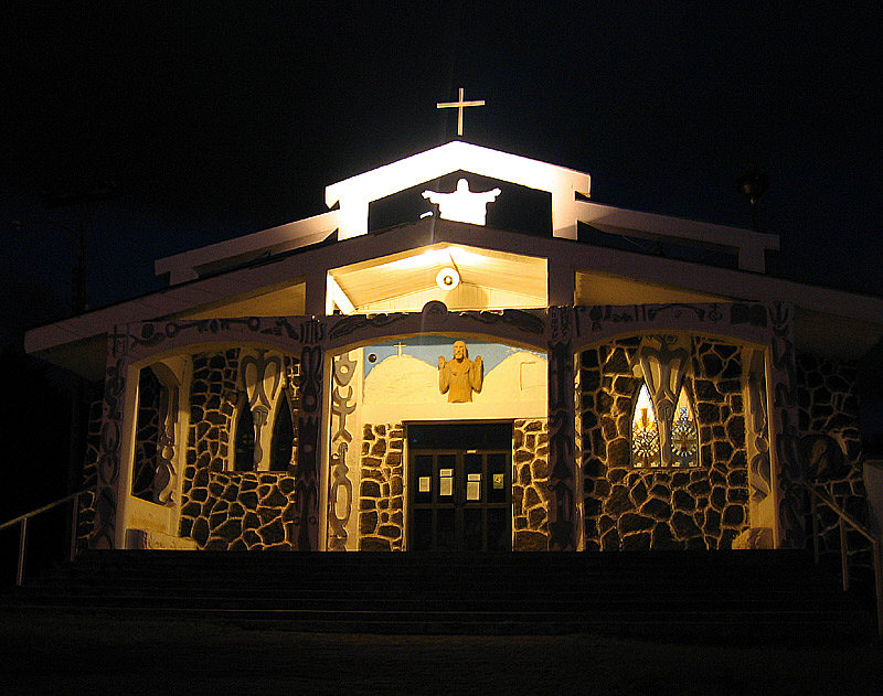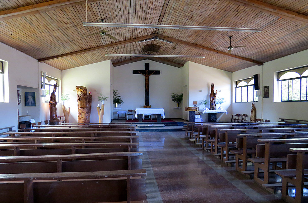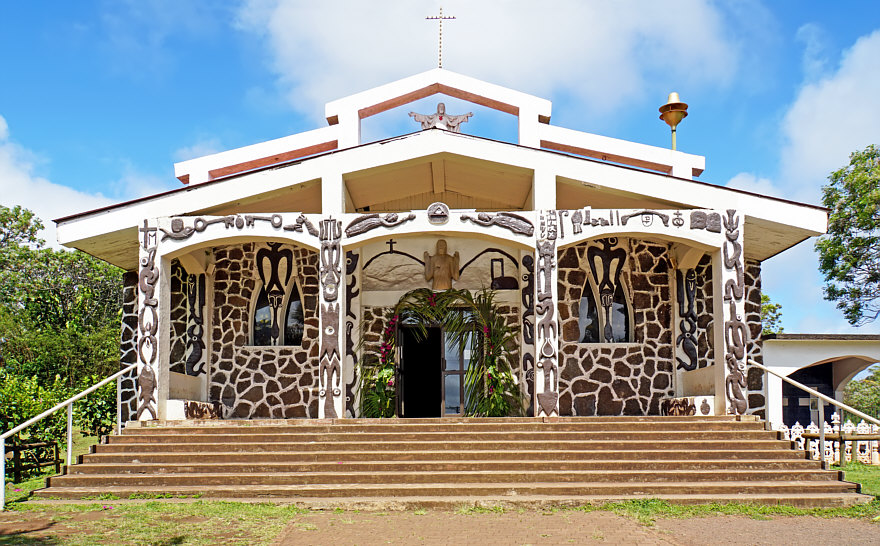Warum hat die Osterinsel genau diesen Namen ? Weil ein Herr Jakob Roggeveen diese Insel am Ostersonntag 1722 entdeckt hat. Auf der Insel, die 24 km lang und 13 km breit ist, gibt es genau eine Kirche und dort sind wir heute. ![]() ![]() Die Kirche vereint die symbolischen Formen der Kirche mit denen aus der Mythologie und Tradition der Rapa Nui. ![]() Schnitzerei der Jungfrau Maria mit dem Jesuskind ![]() Der Erzengel Michael ![]() Die Heilige Familie, aus einem einzigen Baumstamm geschnitzt. Die Skulptur zeigt den heiligen Josef, die Jungfrau Maria und das Jesuskind. In der Mitte befindet sich ein Vogel, der den Heiligen Geist symbolisiert. ![]() Eine Statue der heiligen Therese von Lisieux mit dem Vogelmann-Symbol auf ihrem Arm. ![]() Ein großer, geschnitzter Schrank zur Aufbewahrung der Eucharistie. ![]() Der heilige Franz von Assisi ![]() Das ist die Jesusfigur hinter dem Altar. Bevor ich den Innenraum zeige, hier noch ein Bild der Kirche bei Nacht: ![]() So sieht der Innenraum der Kirche aus: ![]() Willkommen in der Sonntagskirche von Seelenfarben :)). Deine Gedanken zur Kirche und zum Innenraum ? |