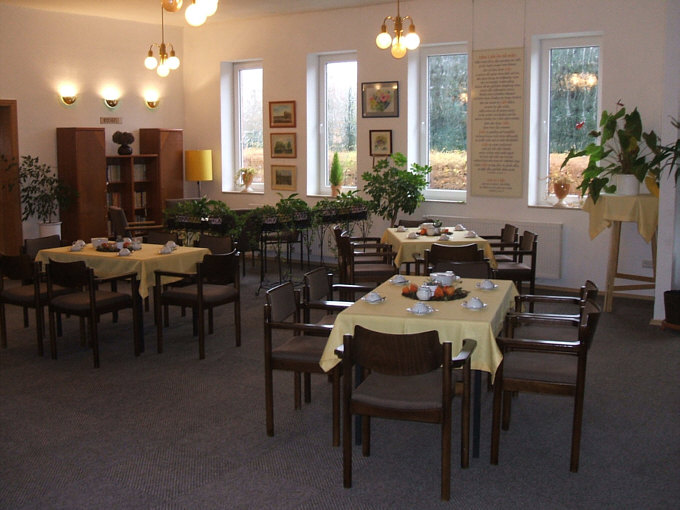 Wir können dann direkt in Raum mit den Tischen und Kaffeetassen gehen, in die