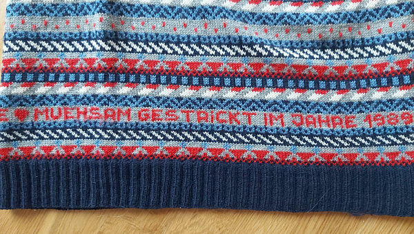 Janna zeigt uns ... ... einen Pulli ... den sie 1989 für ihren (inzwischen verstorbenen) Mann gestrickt hat, mit persönlicher Widmung unten. [Kommentieren]