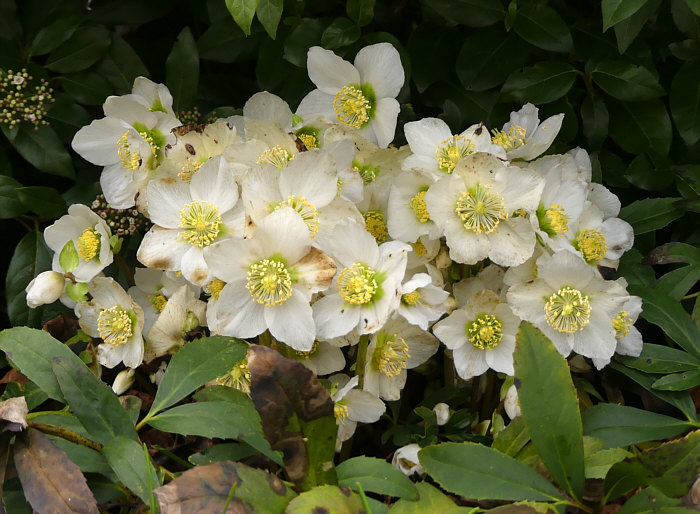 Und am Fuß der Skimmie blüht eine Christrose: