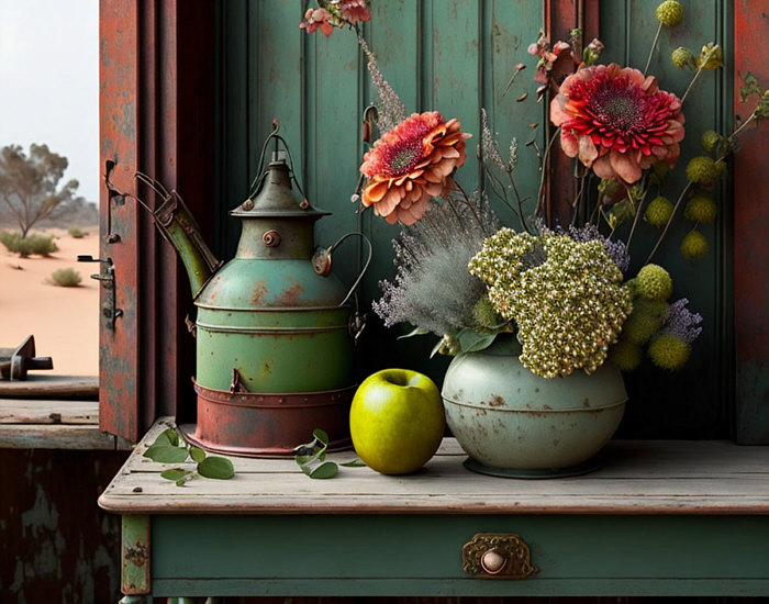 Schön gemaltes Stillleben, staubiger Sand und Grau- und Grüntöne,