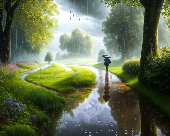 through the dark clouds shines the sun, it is reflected in the rain puddles,