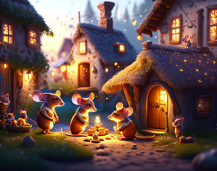 "Family Mouse wearing clothes living like Humans in a little Village.
