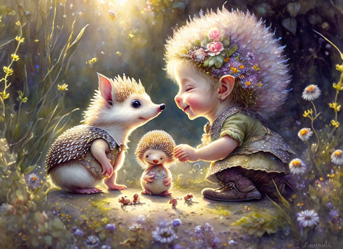 "A cute, happy, tiny elf is playing with a cute, happy, hedgehog"