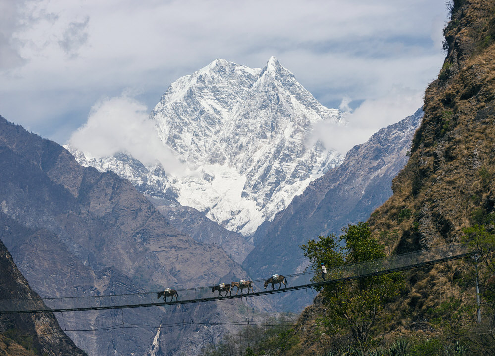 Davor eine große Hängebrücke über den Fluss Kali Gandaki.