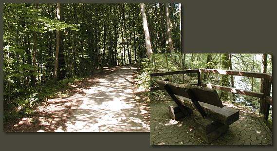 Sonnendurchfluteter Waldweg, ein Bank mit herrlichem Blick aufs Grün ... aber keine Zeit zum Ausruhen und auch noch nicht müde ... doch voller Spannung ... denn in der Nähe rauscht es und bald stehen wir auf einer Brücke