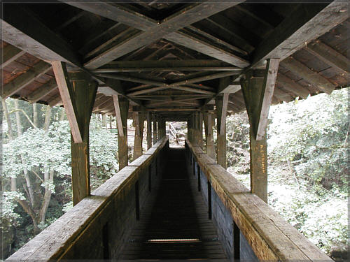 Kirk an Brücke: ich stehe hier mitten im Wald auf einer überdachten Holzbrücke. Wenn ich nach links schaue, dann sehe ich ...
