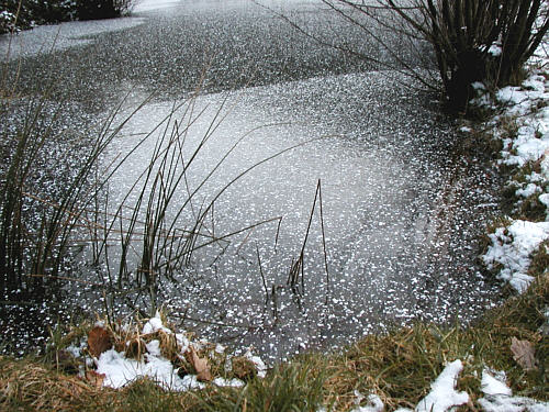 Wenden wir uns also dem Teich zu. Gefroren, doch nicht begehbar. Aber was ist das ?? Dass da ... dort vorne ... dass da wo (watt'nen Deutsch *g*) so aus dem Eis rauskuckt ? Mal näher betrachten ...